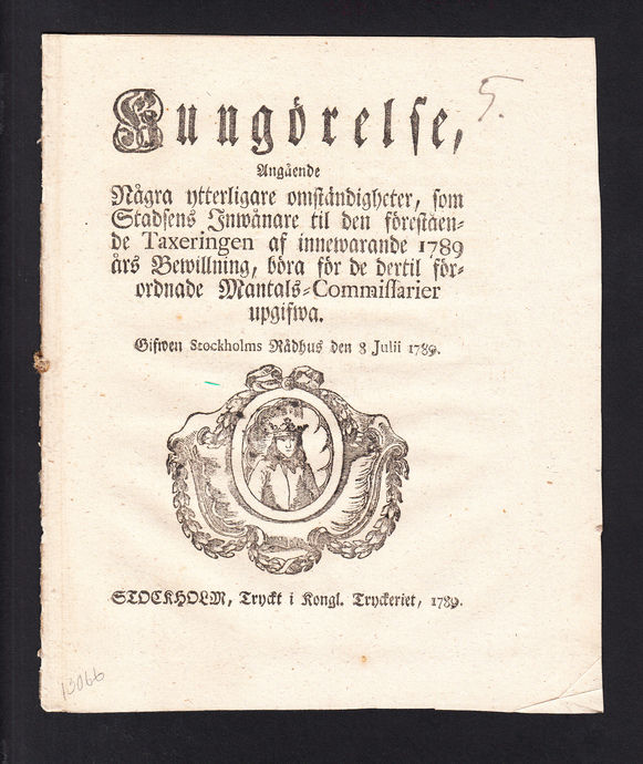 Kungörelse, Angående Några ytterligare omständigheter, som Stadsens Inwånare til den förestående taxeringen af innewarande 1789 års Bewillning, böra för de dertil förordnade Mantals-Commissarier upgifwa. Gifwen Stockholms Rådhus den 8 Julii 1789.