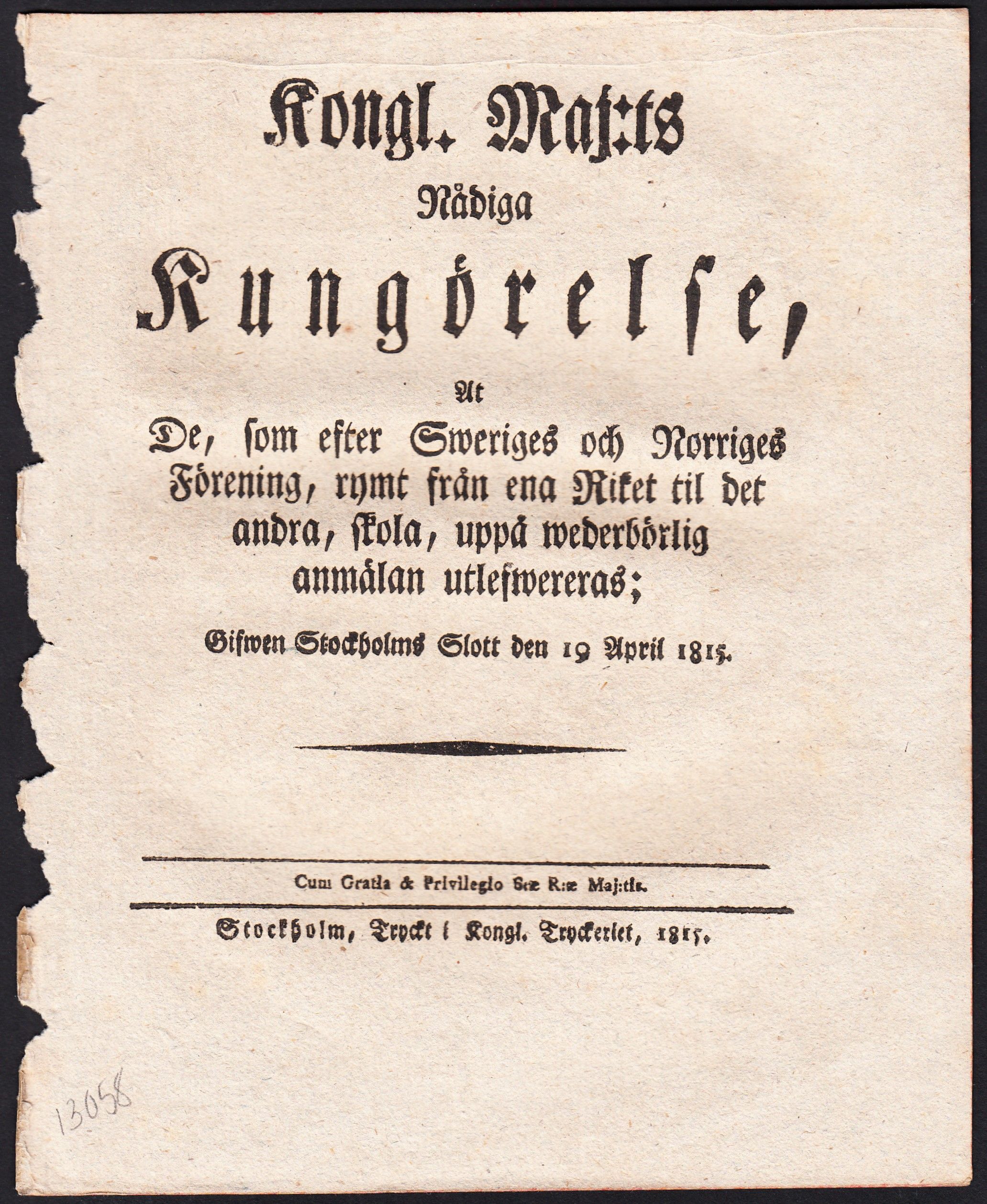 Kongl. Maj:ts Nådiga Kungörelse, At De, som efter Sweriges och Norriges Förening, rymt från ena Riket til det andra, skola, uppå wederbörlig anmälan utlefwereras; Gifwen Stockholms Slott den 19 april 1815.