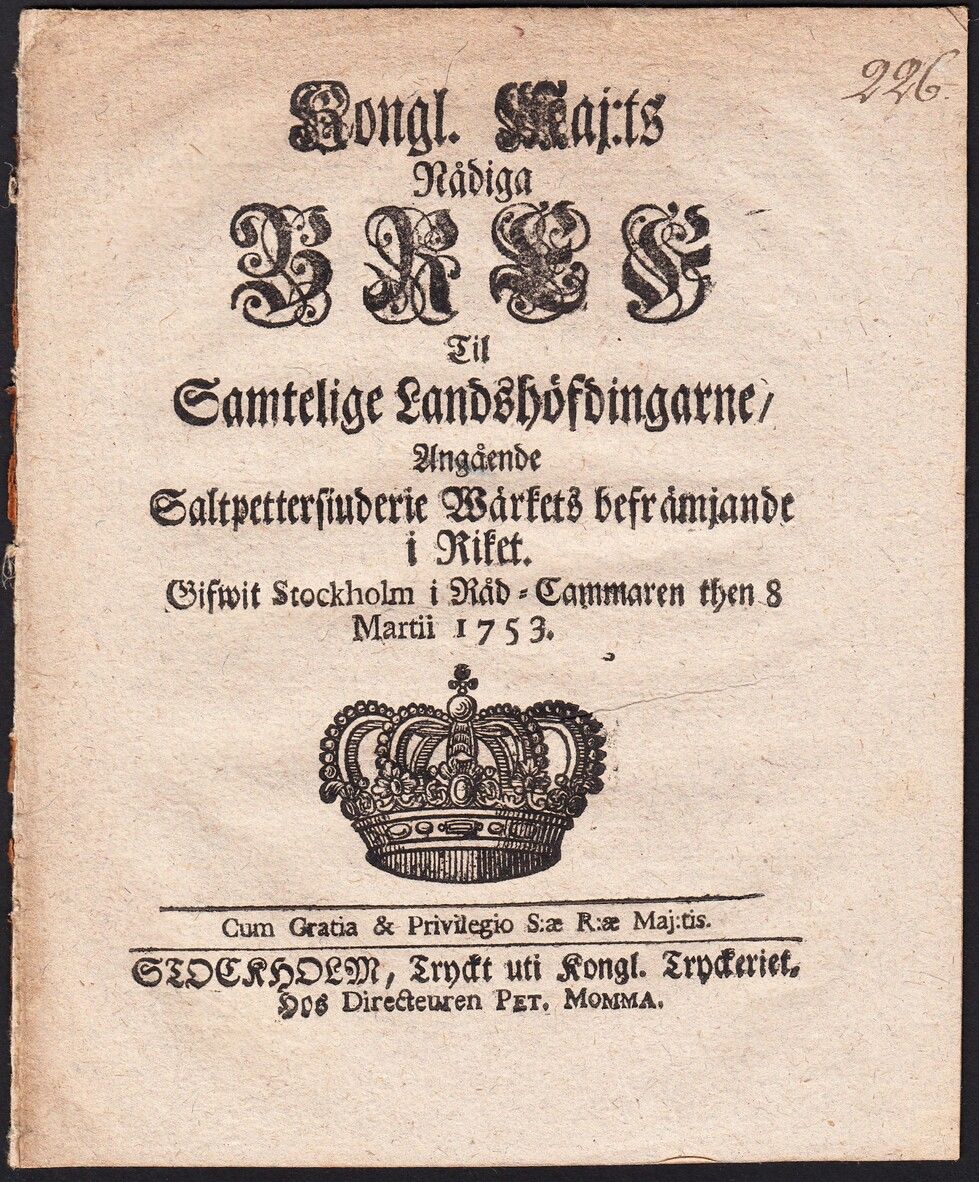Kongl. Maj:ts Nådiga Bref Til Samtelige Landshöfdingarne, Angående Saltpettersiuderie Wärkets befrämjande i Riket. Gifwit Stockholm i Råd-Cammaren then 8 Martii 1753.