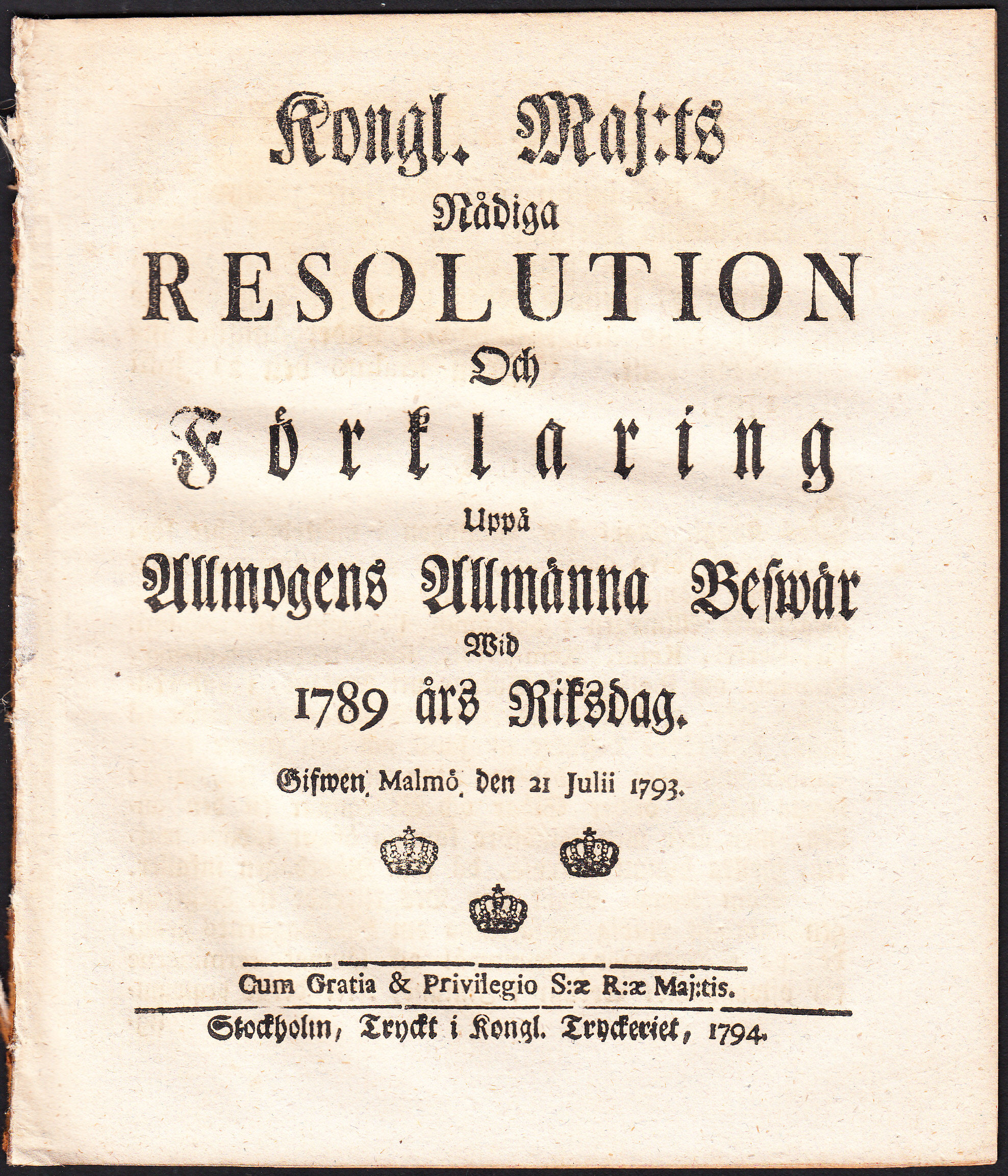 Kongl. maj:ts nådiga resolution och förklaring uppå allmogens allmänna beswär wid 1789 års riksdag. Gifwen Malmö den 21 julii 1793.