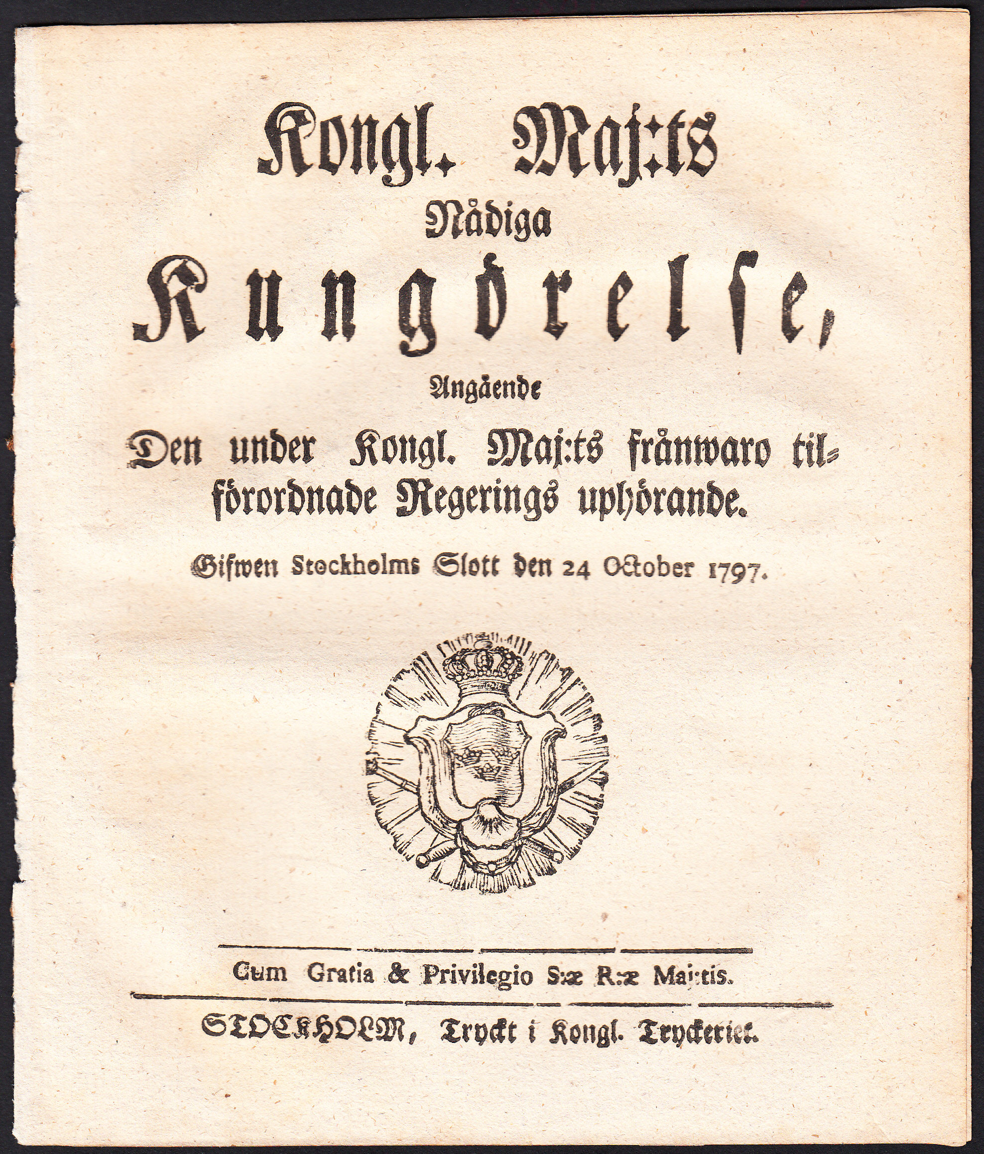 Kongl. Maj:ts Nådiga Kungörelse, Angående Den under Kongl. Maj:ts frånwaro tilförordnade Regerings uphörande. Gifwen Stockholms Slott den 24 october 1797.