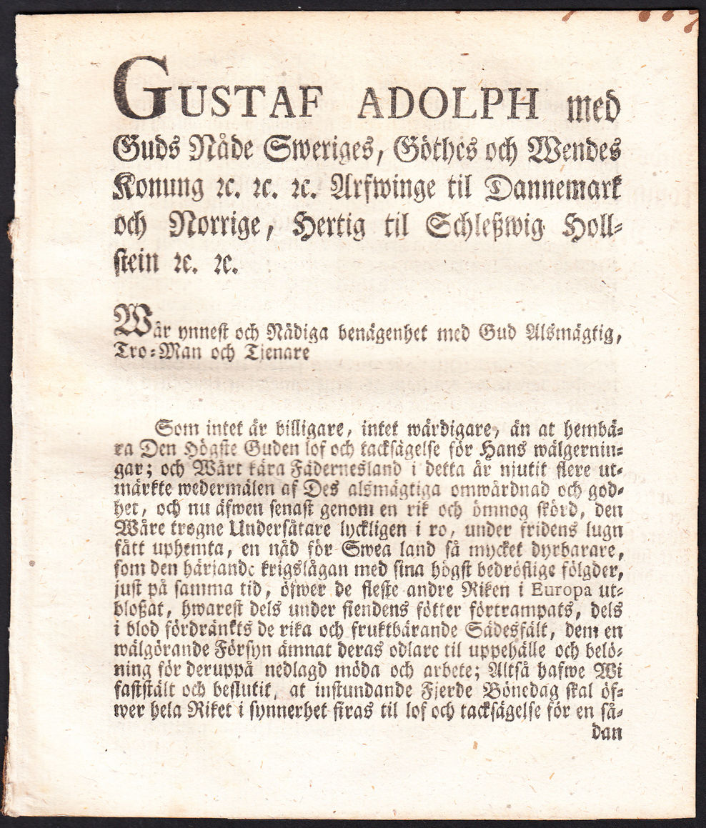 Gustaf Adolph med Guds Nåde Sweriges, Göthes och Wendes Konung ... Som intet är billigare, intet wärdigare, än at hembära Den Högste Guden lof och tacksägelse för Hans wälgerningar ...