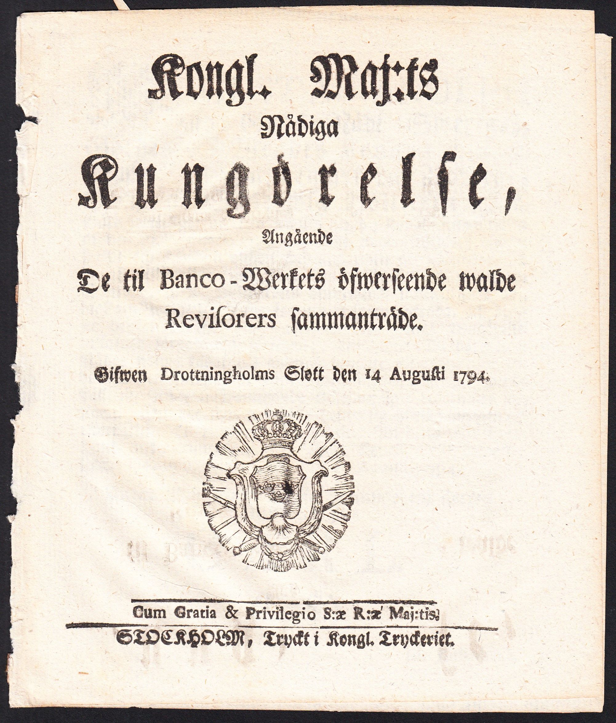 Kongl. Maj:ts Nådiga Kungörelse, Angående De til Banco-Werkets öfwerseende walde Revisorers sammanträde. Gifwen Drottningholms Slott den 14 Augusti 1794.