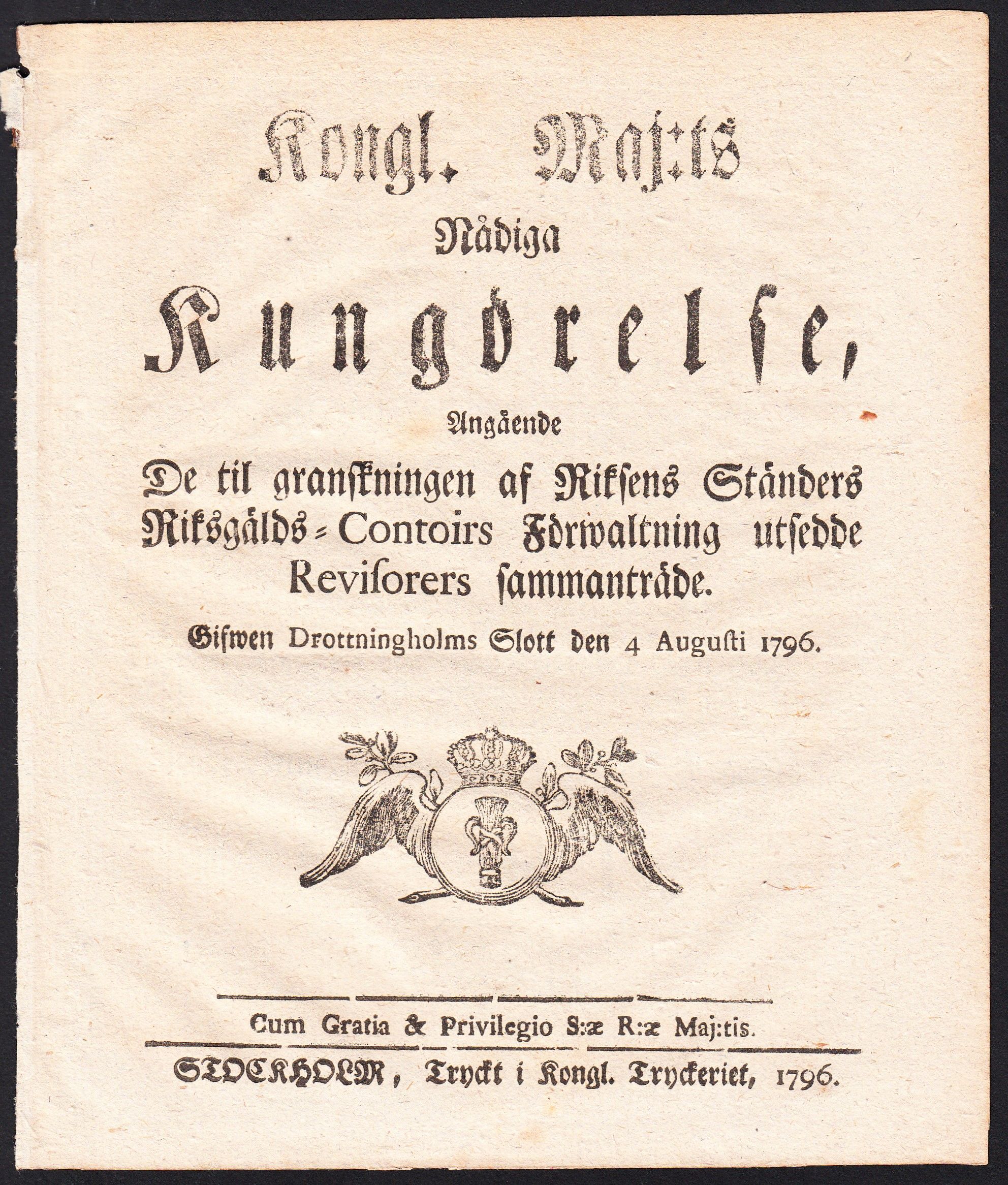 Kongl. maj:ts nådiga Kungörelse, Angående De til granskningen af Riksens Ständers Riksgälds-Contoirs Förwaltning utsedde Revisorers sammanträde. Gifwen Drottningholms Slott den 4 augusti 1796.