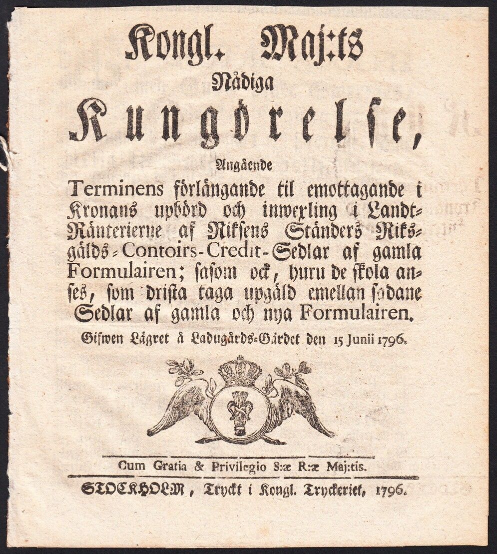 Kongl. maj:ts nådiga Kungörelse, Angående Terminens förlängande til emottagande i Kronans upbörd och inwexling i Landt-Ränterierne af Riksens Ständers Riksgälds-Contoirs-Credit-Sedlar af gamla Formulairen; såsom ock, huru de skola anses, som drista taga upgäld emellan sådanne Sedlar af gamla och nya Formulairen. Gifwen lägret å Ladugårds-Gärdet den 15 junii 1796.