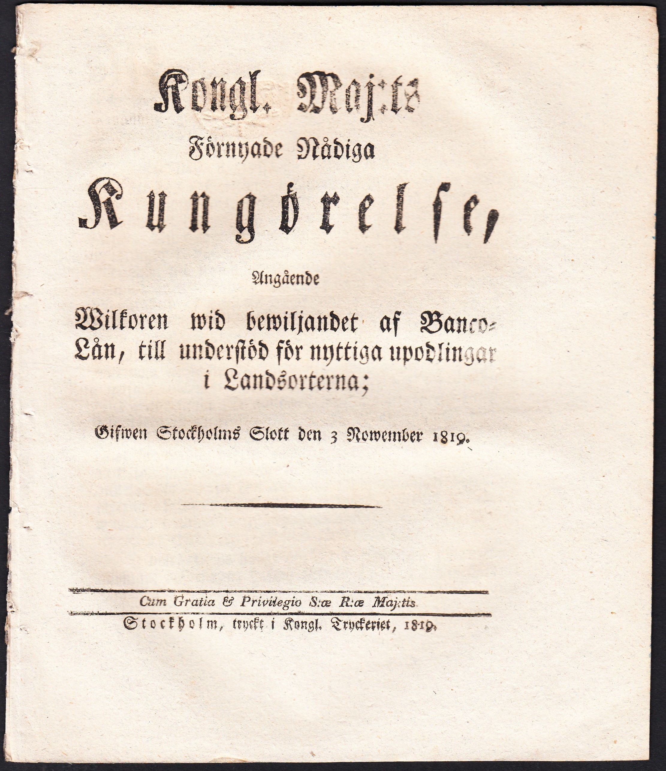 Kongl. Maj:ts Nådiga Förnyade Kungörelse, Angående Wilkoren wid bewiljandet af Banco-Lån, till understöd för nyttiga upodlingar i Landsorterna; Gifwen Stockholms Slott den 3 Nowember 1819.