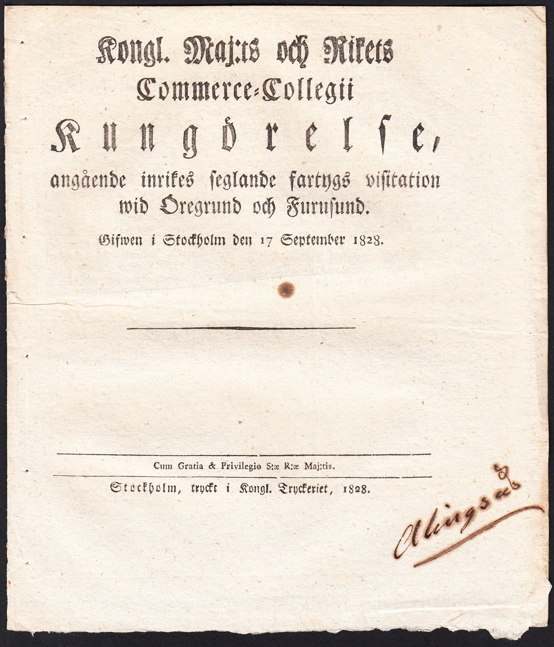 Kongl. maj:ts och Rikets Commerce-collegii Kungörelse, angående inrikes seglande fartygs visitation wid Öregrund och Furusund. Gifwen i Stockholm den 17 september 1828.