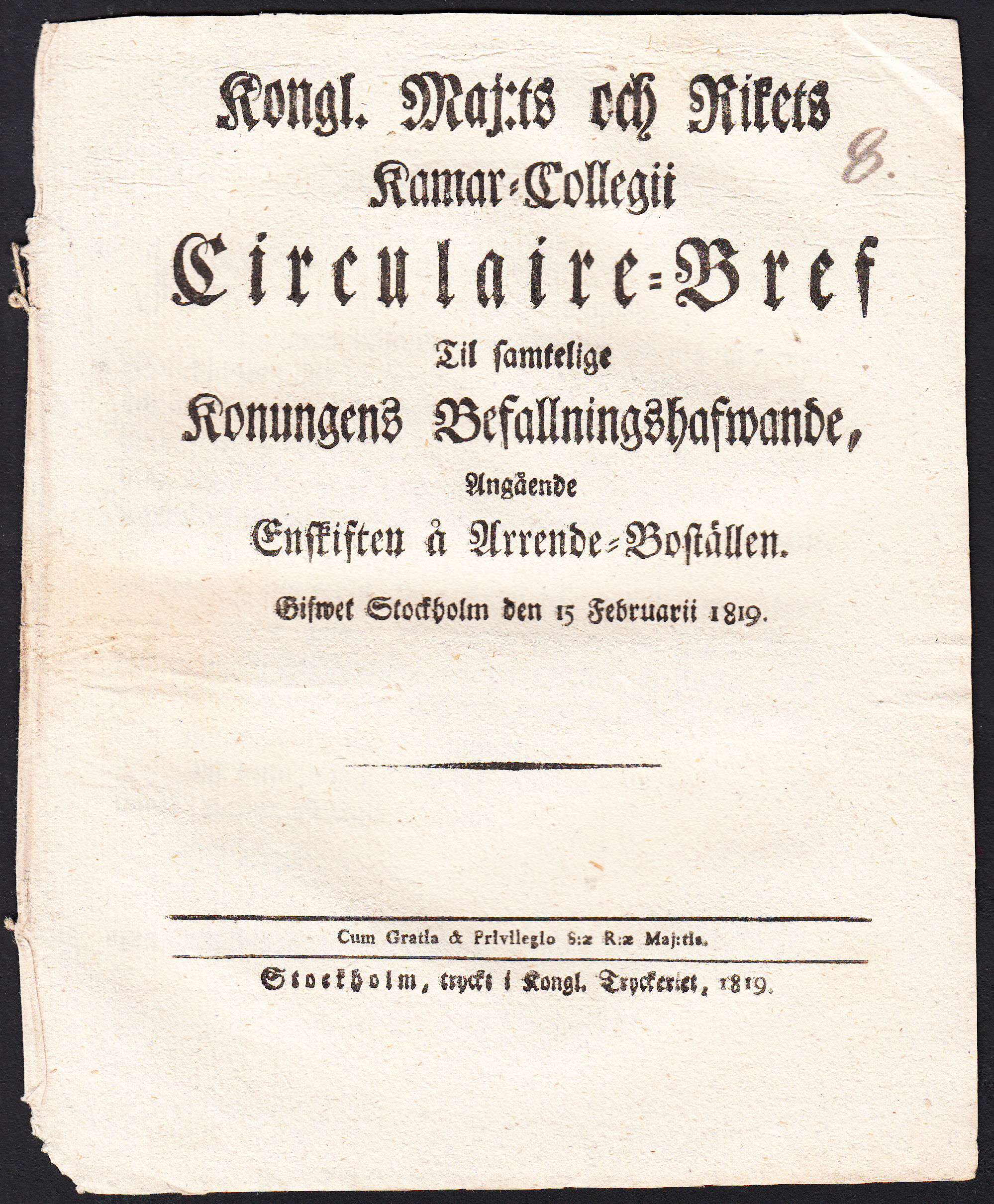 Kongl. Maj:ts Och Rikets Kamar-Collegii Circulaire-Bref Til samtelige Konungens Befallningshafwande, Angående Enskiften å Arrende-Boställen. Gifwet Stockholm den 15 Februarii 1819.