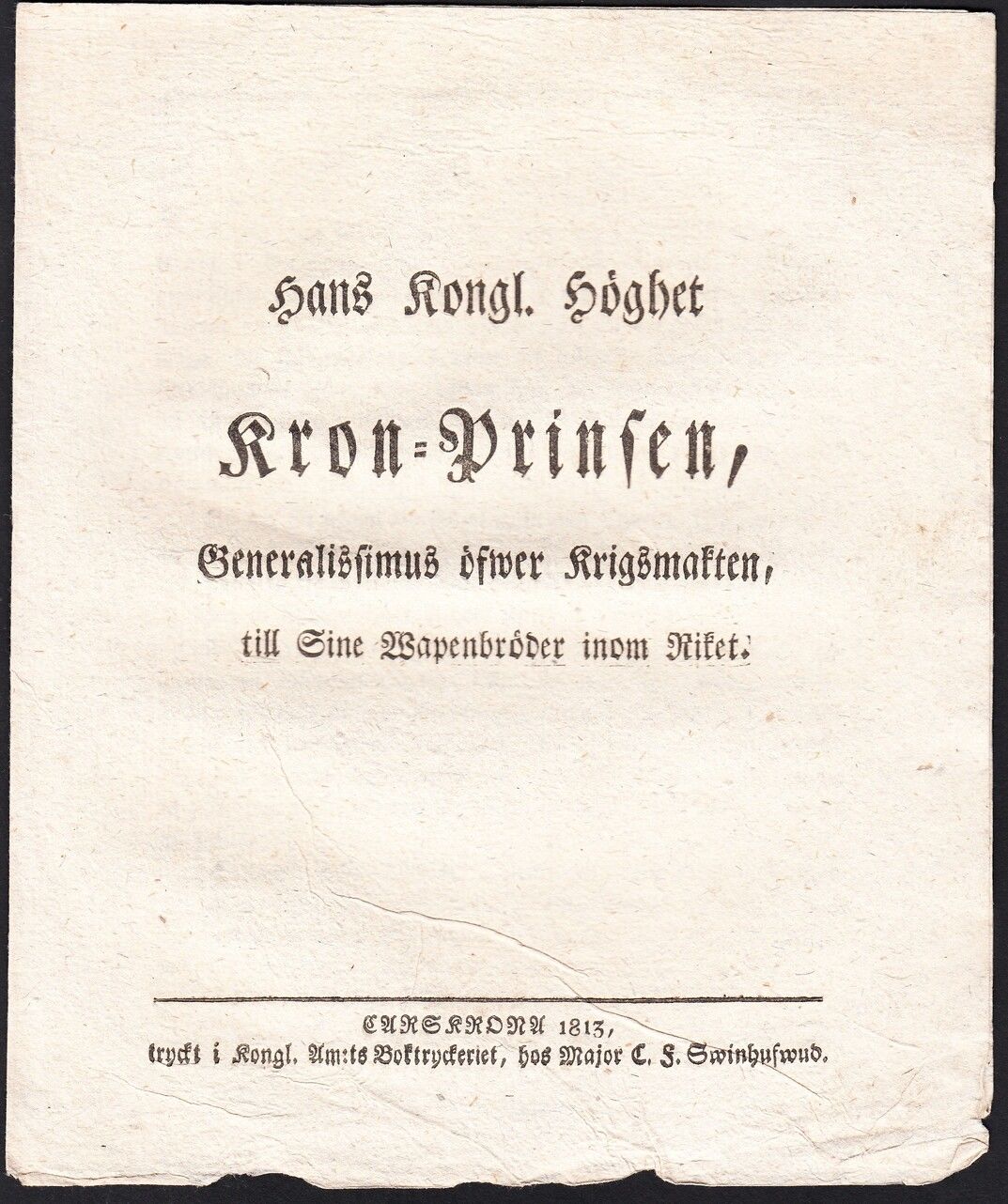 Hans kongl. höghet kron-prinsen, generalissimus öfwer krigsmakten, till sine wapenbröder inom riket.