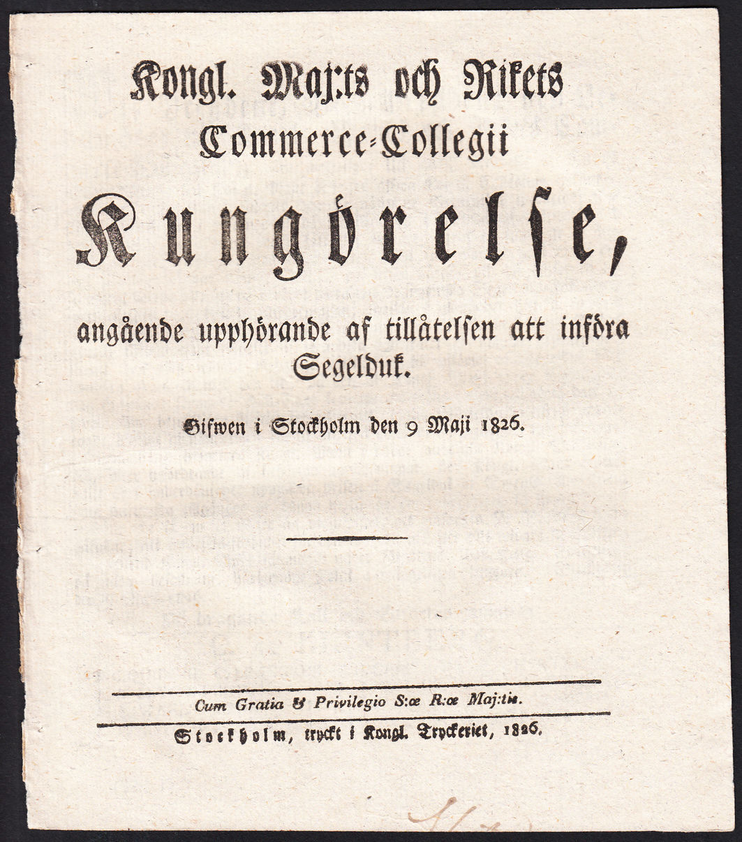 Kongl. maj:ts och Rikets Commerce-collegii Kungörelse, angående upphörande af tillåtelsen att införa Segelduk. Gifwen i Stockholm den 9 maji 1826.