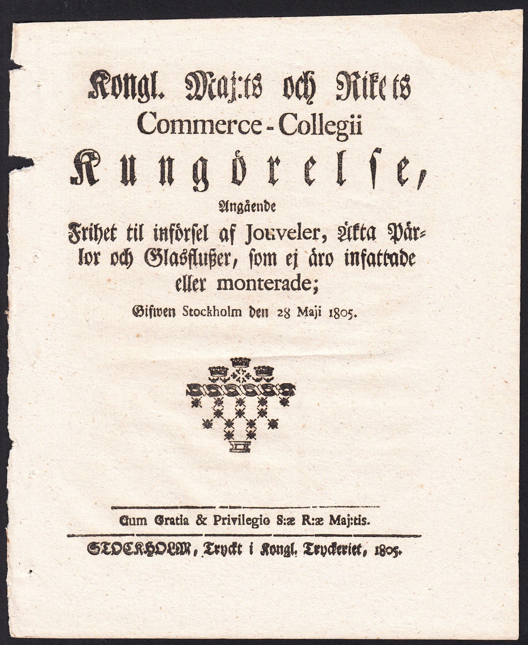 Kongl. Maj:ts och Rikets Commerce-Collegii Kungörelse, Angående Frihet til införsel af Jouveler, Äkta Pärlor och Glasfluszer, som ej äro infattade eller monterade; Gifwen Stockholm den 28 maji 1805.