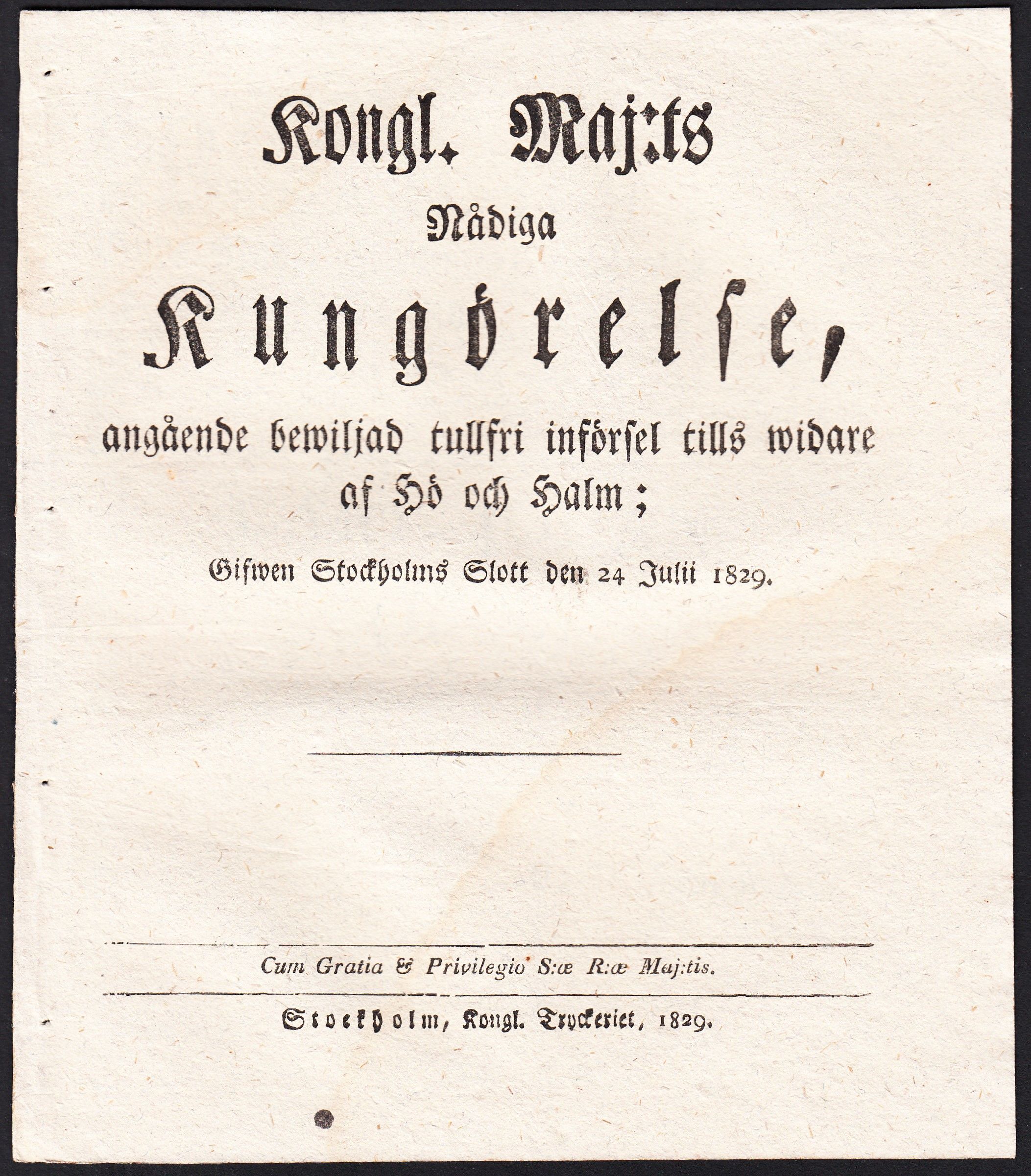 Kongl. maj:ts nådiga Kungörelse, angående bewiljad tullfri införsel tills widare af Hö och Halm; Gifwen Stockholms Slott den 24 julii 1829.