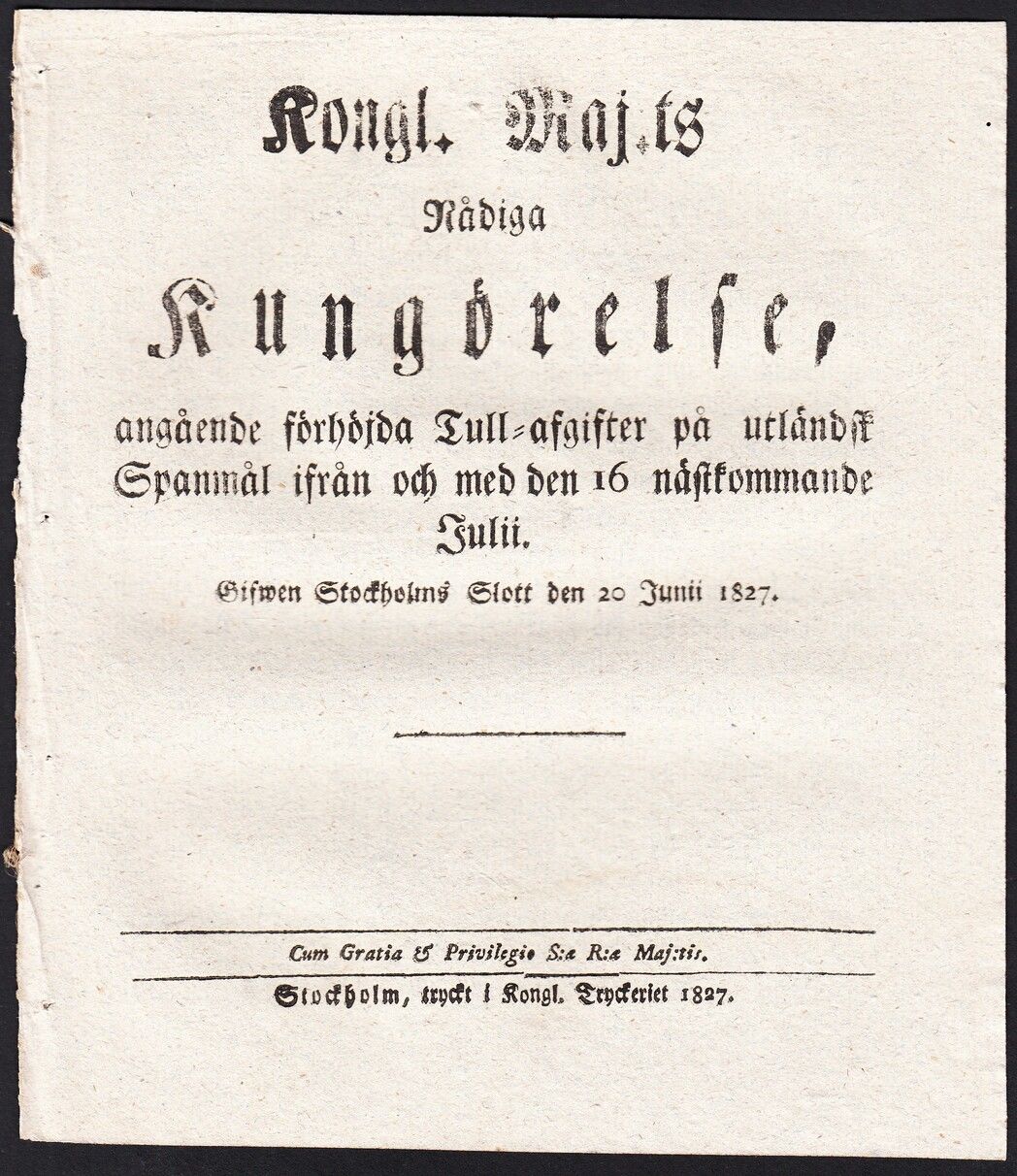 Kongl. Maj:ts Nådiga Kungörelse, angående förhöjda Tull-afgifter på utländskt Spanmål ifrån och med den 16 nästkommande Julii. Gifwen Stockholms slott den 20 junii 1827.