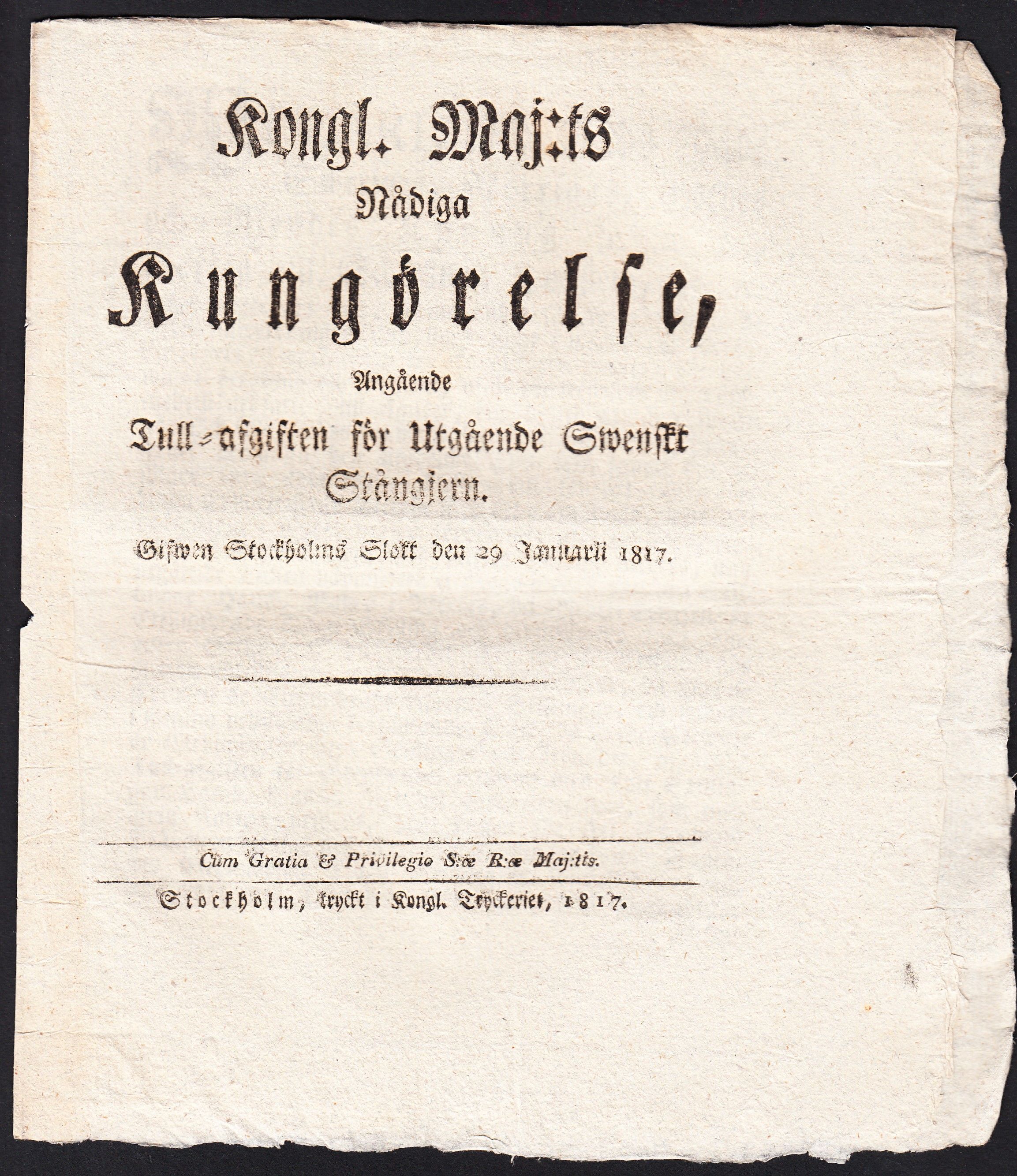 Kongl. Maj:ts Nådiga Kungörelse, Angående Tull-afgiften för Utgående Swenskt Stångjern. Gifwen Stockholms Slott den 29 januarii 1817.