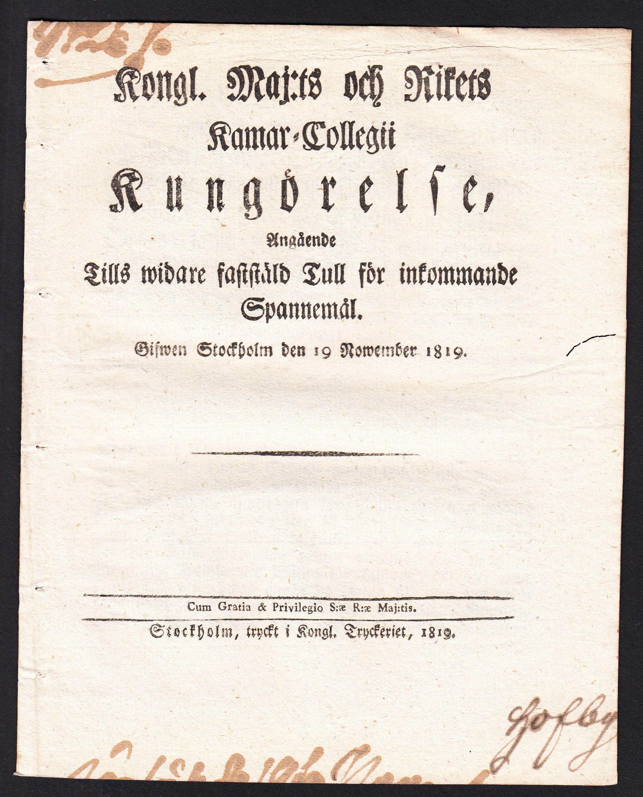 Kongl. Maj:ts och Rikets Kamar-Collegii Kungörelse, Angående Tills widare faststäld Tull för inkommande Spannemål. Gifwen Stockholm den 19 Nowember 1819.