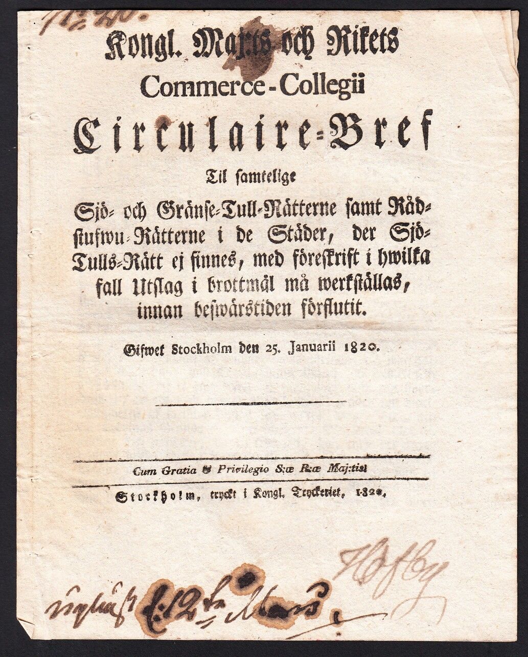 Kongl. Maj:ts och Rikets Commerce-Collegii Circulaire-Bref Til samtelige Sjö- och Gränse-Tull-Rätterne samt Rådstufwu-Rätterne i de Städer, der Sjö-Tulls-Rätt ej finnes, med föreskrift i hwilka fall Utslag i brottmål må werkställas, innan beswärstiden förflutit. Gifwet Stockholm den 25. Januarii 1820.