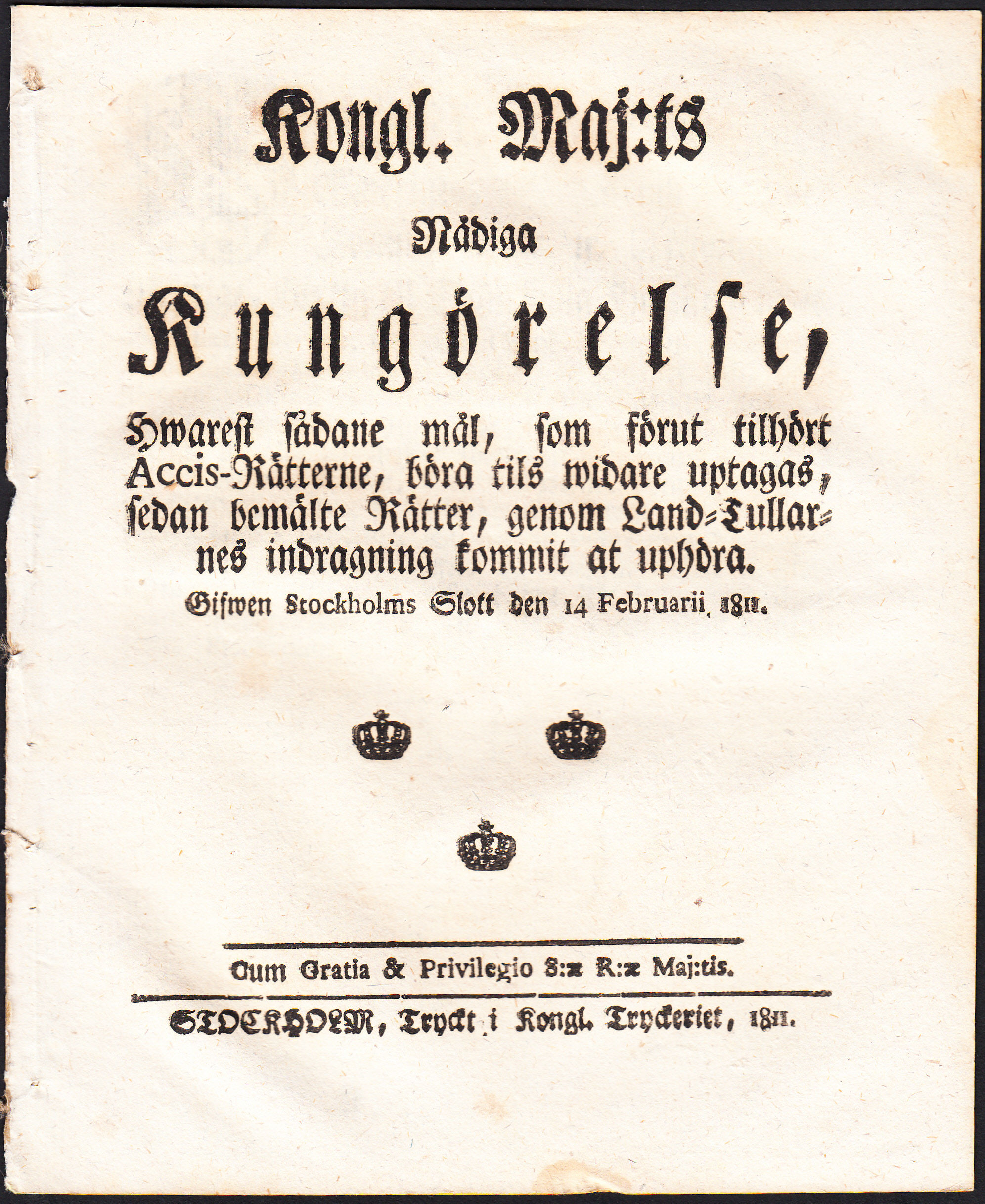 Kongl. Maj:ts Nådiga Kungörelse, Hwarest sådane mål, som förut tilhört Accis-Rätterne, böra tils widare uptagas, sedan bemälte Rätter, genom Land-Tullarnes indragning kommit at uphöra. Gifwen Stockholms Slott den 14 Februarii 1811.