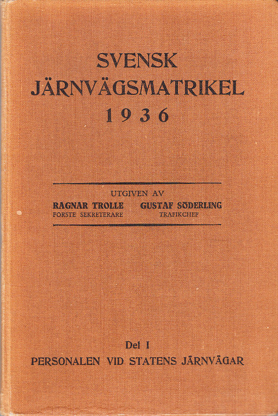 Endast tillgänglig på 4 Libris-bibliotek (KB, KrA, RA, SSA). Del 2. Personalen vid Sveriges enskilda järnvägar utkom s.å. Innehåll: Statens järnvägars omfattning samt indelning i distrikt, ban-, maskin- och trafiksektioner; Personalia rörande i matrikeln upptagna tjänstemän (Kungl. Järnvägsstyrelsen; Kungl. Järnvägsstyrelsens byråer och kontor; Distrikten; Förrådsavdelningarna; Huvudverkstäderna; Vissa icke ordinarie tjänstemän; Tjänstemän vid Statens järnvägsbyggnader); Järnvägsrådet; Kommunikationsverkens lönenämnden, Statens bostadsnämnd, Tjänstgöringsnämnden vid Statens järnvägar samt Verkställande förvaltningen för järnvägarnas godssamtrafik och Samtrafiksnämnden; Tablå över antalet befattningar i olika grader vid Statens järnvägar enligt avlöningsstaterna för åren 1930, 1932, 1934 och 1936; Anciennitetslista för i matrikeln upptagna ordinarie tjänstemän vid Statens järnvägar; Innehavare av högre tjänstemannabefattningar sedan tidigare år; Pensionsinrättningar, sällskap m.m.; Använda förkortningar; Tillägg; Stationsnamnregister, hänförande sig till uppgifterna å resp. stationsföreståndare i avd. IIc; Personnamnregister.