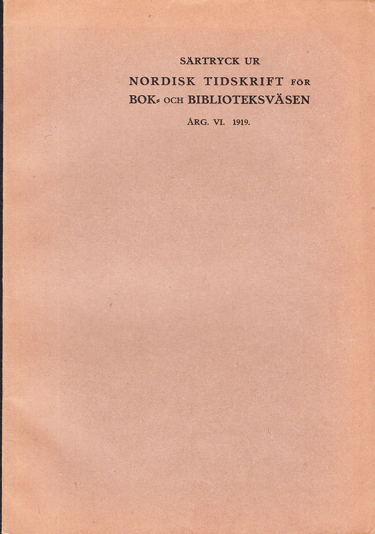 Särtryck ur ‘Nordisk Tidskrift för Bok- och Biblioteksväsen, årg. 6 (1919)’.
