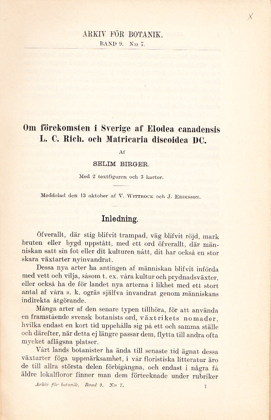 Om förekomsten i Sverige af Elodea canadensis L. C. Rich. och Matricaria discoidea DC. Med 2 textfiguren och 3 kartor. Meddelad den 13 oktober af V. Wittrock och J. Eriksson [= rubrik].