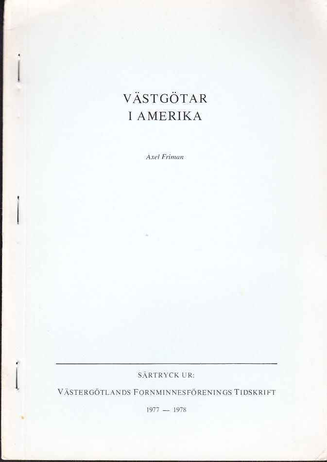 Innehåll: Initiativ i Västergötland; Emigrantlistor; Moninativa utdrag rörande emigranter; Invandrarhamnarnas skeppsmanifest; Västergötland; Dalsland; USA:s 200-årsjubileum; Vad bör vi göra?; Hur många reste ‘hem’ igen?; Hur det började; De västgötska pionjärerna [en kronologisk förteckning över det första hundratalet emigranter, 1829-1850]; De mest namnkunniga; Hur ‘smittan’ spreds; Några forskningsuppgifter; 1975 års svenskamerikan av västgötsk härstamning; Snart är det för sent.
