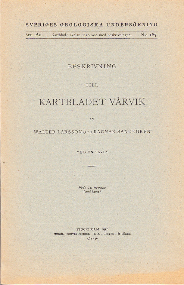 Sveriges geologiska undersökning. Serie Aa, Kartblad i skalan 1:50 000 med beskrivningar 187. Endast tillgänglig i 3 Libris-bibliotek (KB, SGU, Umeå UB). Innehåll: Inledning; Berggrunden; Jordlagren; Källor; Fornlämningar.