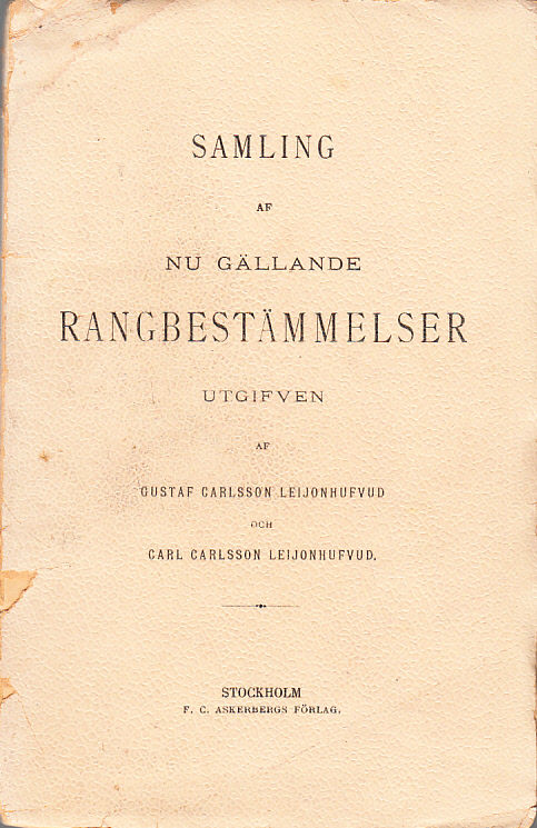 Samling af nu gällande rangbestämmelser, utgifven af Gustaf Carlsson Leijonhufvud och Carl Carlsson Leijonhufvud.