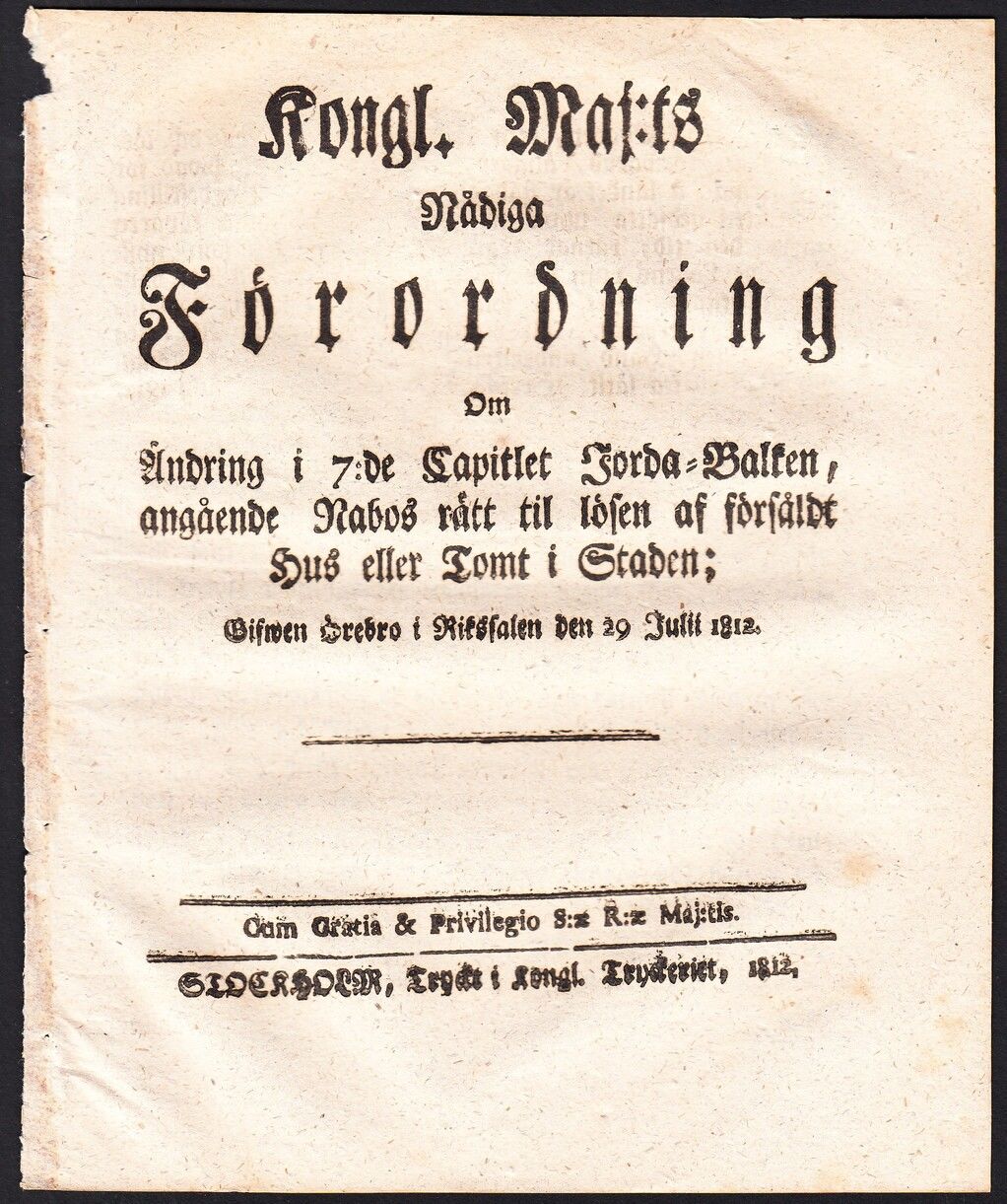 Kongl. Maj:ts Nådiga Förordning Om Ändring i 7:de Capitlet Jorda-Balken, angående Nabos rätt til lösen af försåldt Hus eller Tomt i Staden; Gifwen Örebro i Rikssalen den 29 Julii 1812.