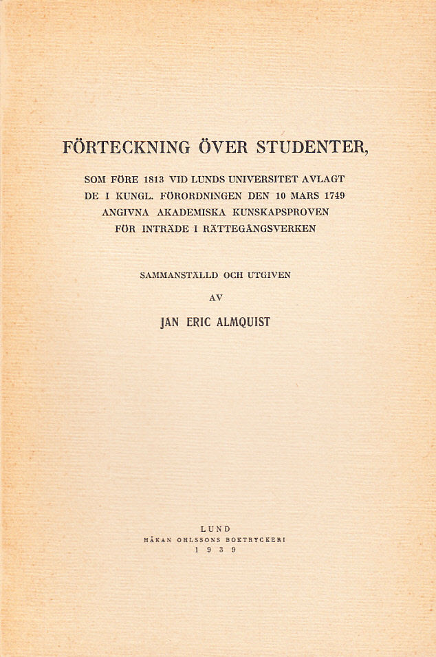 Förteckning över studenter, som före 1813 vid Lunds universitet avlagt de i Kungl. förordningen den 10 mars 1749 angivna akademiska kunskapsproven för inträde i rättegångsverken. Sammanställd och utgiven.