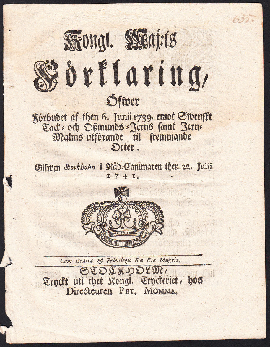 Kongl. Maj:ts Förklaring, Öfwer Förbudet af then 6. junii 1739. emot Swenskt Tack- och Oszmunds-Jerns samt Jern-Malms utförande til fremmande Orter. Gifwen Stockholm i Råd-Cammaren then 22. julii 1741.