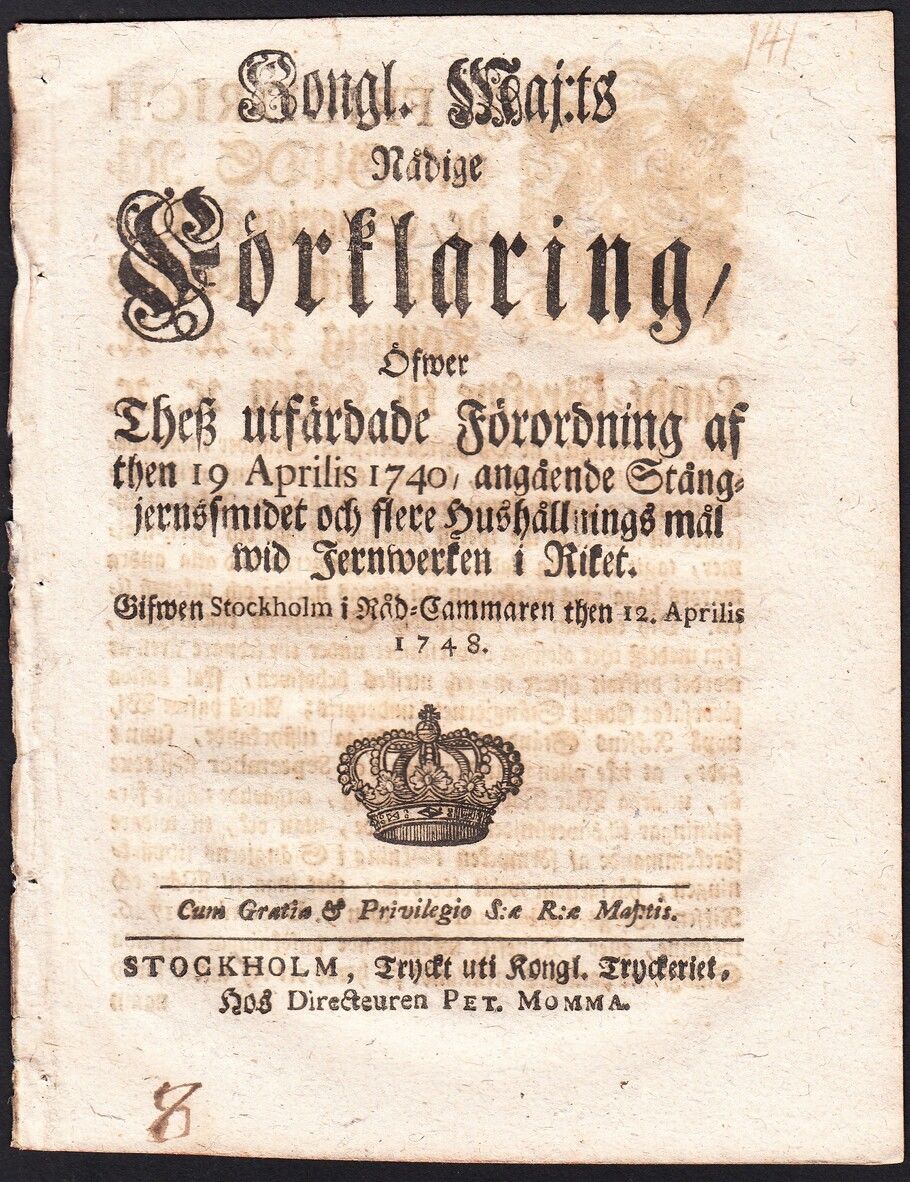 Kongl. Maj:ts Nådige Förklaring, Öfwer Thesz utfärdade Förordning af then 19. Aprilis 1740, angående Stångjernssmidet och flere Hushållnings mål wid Jernwerken i Riket. Gifwen Stockholm i Råd-Cammaren then 12. Aprilis 1748.