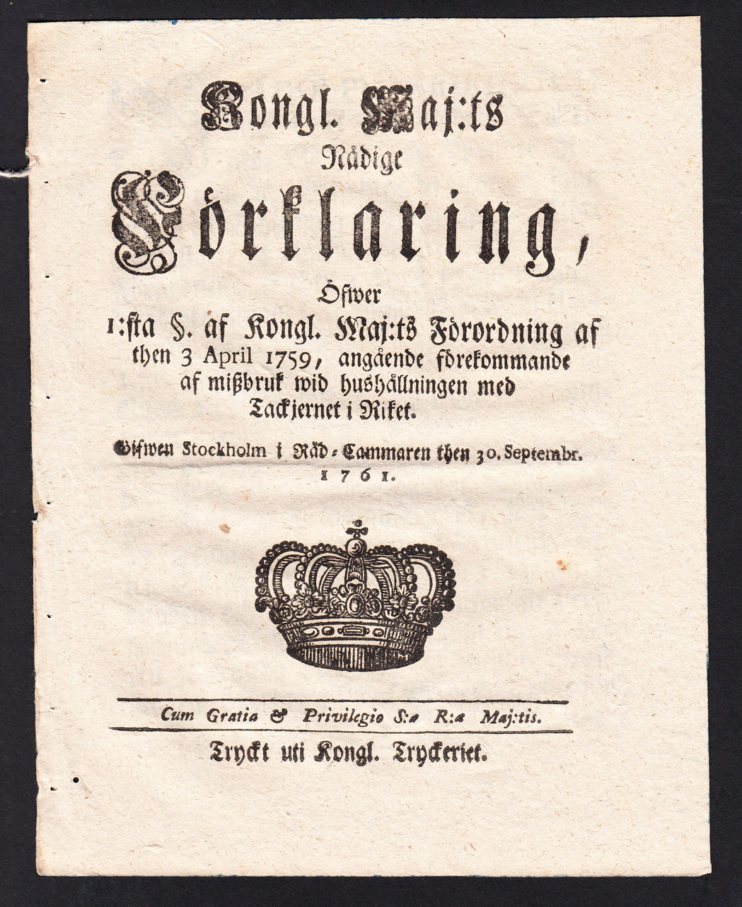 Kongl. Maj:ts Nådige Förklaring, Öfwer 1:sta §. af Kongl. Maj:ts Förordning af then 3 April 1759, angående förekommande af miszbruk wid hushållningen med Tackjernet i Riket. Gifwen Stockholm i Råd-Cammaren then 30. Septembr. 1761.