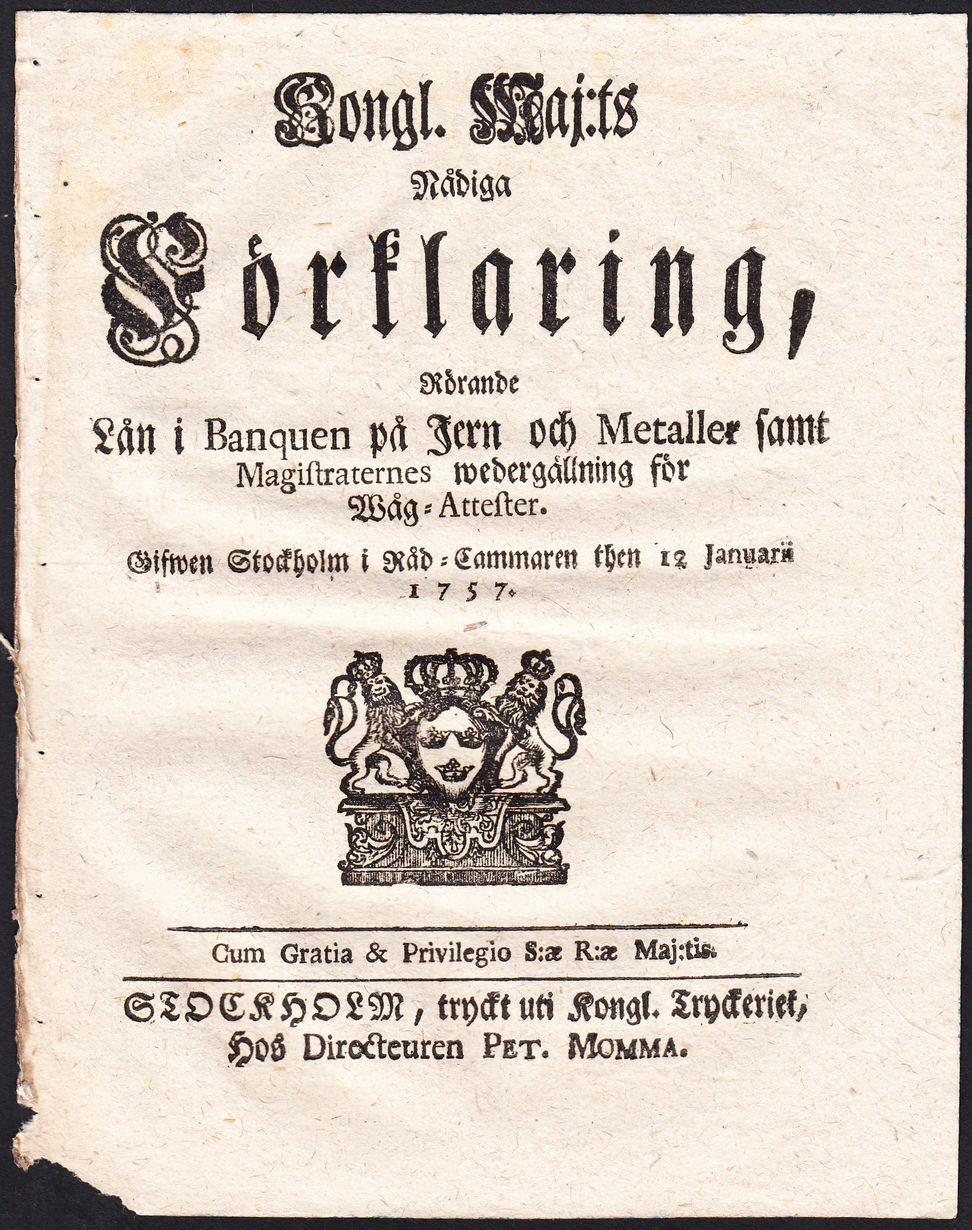Kongl. maj:ts nådiga Förklaring, Rörande Lån i Banquen på Jern och Metaller samt Magistraternes wedergällning för Wåg-Attester. Gifwen Stockholm i råd-cammaren then 12 januarii 1757.