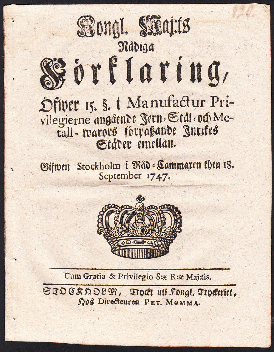 Kongl. Maj:ts Nådiga Förklaring, Öfwer 15. §. i Manufactur Privilegierne angående Jern- Stål- och Metall-warors förpaszande Inrikes Städer emellan. Gifwen Stockholm i Råd-Cammaren then 18. September 1747.