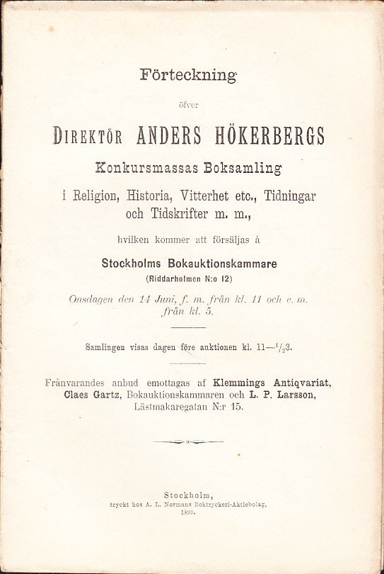 Förteckning öfver Direktör Anders Hökerbergs konkursmassas boksamling i Religion, Historia, Vitterhet etc., Tidningar och Tidskrifter m.m. hvilken kommer att försäljas å Stockholms Bokauktionskammare (Riddarholmen N:o 12). Onsdagen den 14 juni ...