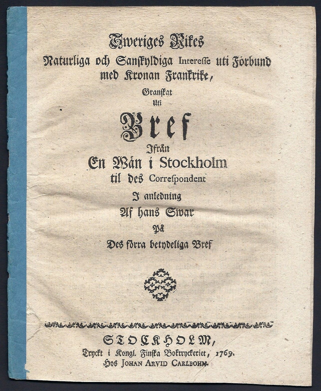 Sweriges rikes naturliga och sanskyldiga interesse uti förbund med kronan Frankrike, granskat uti bref ifrån en wän i Stockholm til des correspondent i anledning af hans swar på des förra betydeliga bref.