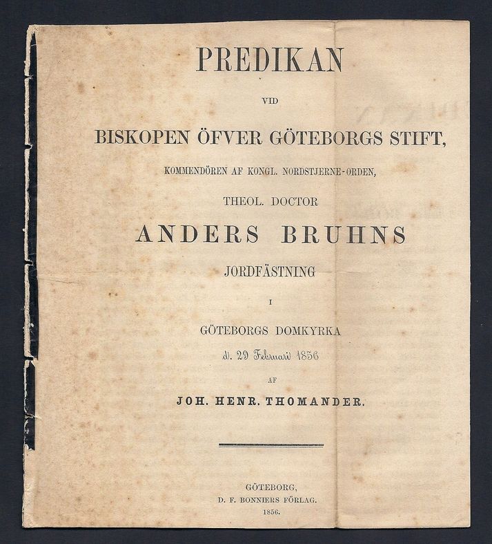 Göteborg, tryckt hos D.F. Bonnier, 1856. 8:o. 12 s. Tagen ur band, något hårt skuren. Rester efter svart pappersryggremsa. Något solkig och lagerfläckad, längsgående vikmärke.