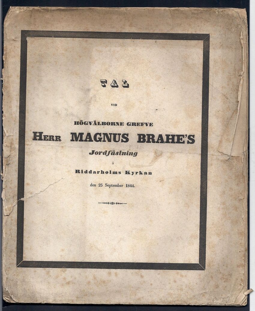 Tal vid en af rikets herrar, riks-marskalken, general-löjtnanten m.m. riddaren och kommendören af Kongl. maj:ts orden riddaren af konung Carl XIII:s orden, m. fl. o. högvälborne grefve herr Magnus Brahe's jordfästning i Riddarholmskyrkan den 25 september 1844 i H.M. konungens, H.K.H. kronprinsens och H.K.H. arffursten hertigens af Upland höga öfvervaro. Hållet af C.I. Heurlin ...