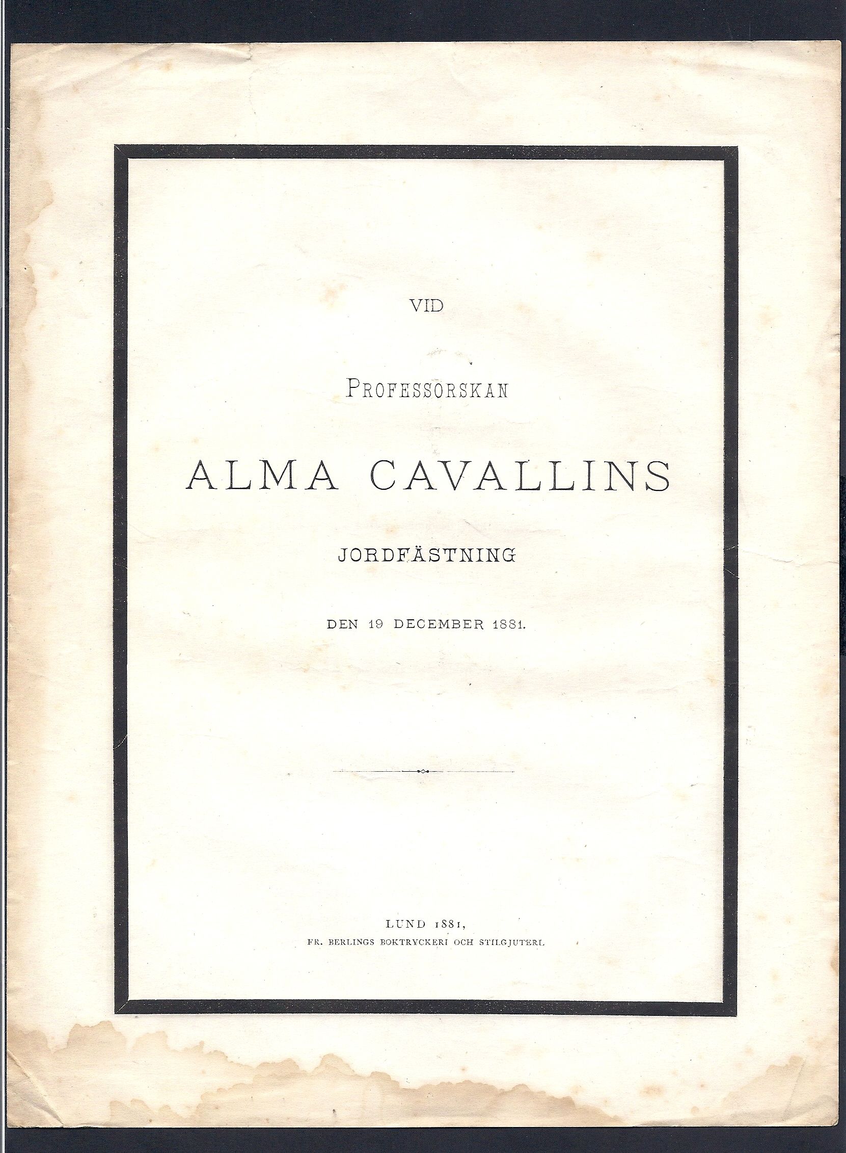 Vid professorskan Alma Cavallins jordfästning den 19 dec. 1881.