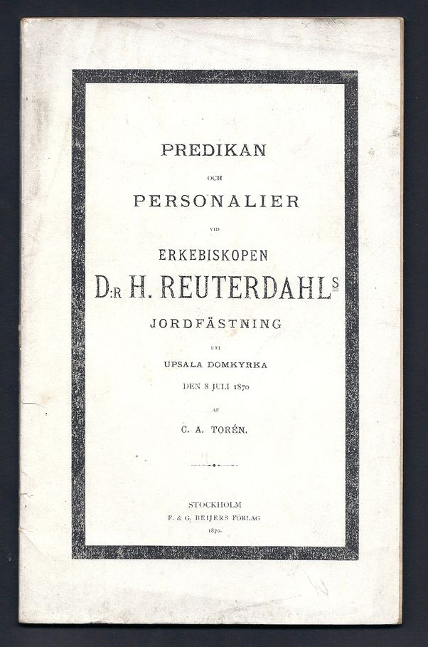 Predikan och personalier vid erkebiskopen d:r Henrik Reuterdahls jordfästning uti Upsala domkyrka den 8 juli 1870 af C. A. Torén. [Utg. av] F. & G. Beijers förlag.