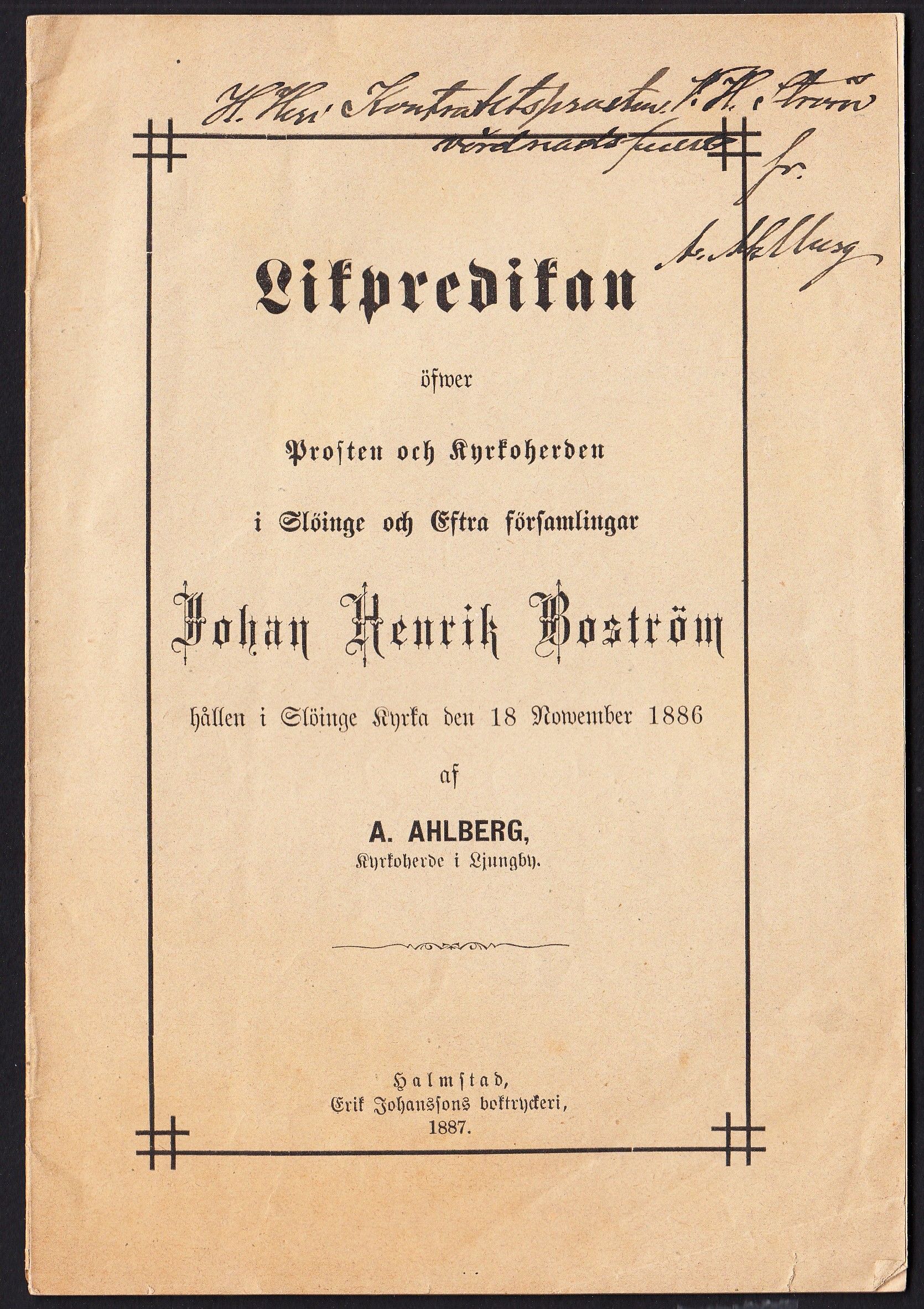 Likpredikan öfwer prosten och kyrkoherden i Slöinge och Eftra församlingar Johan Henrik Boström hållen i Slöinge kyrka den 18 november 1886 af A. Ahlberg ...