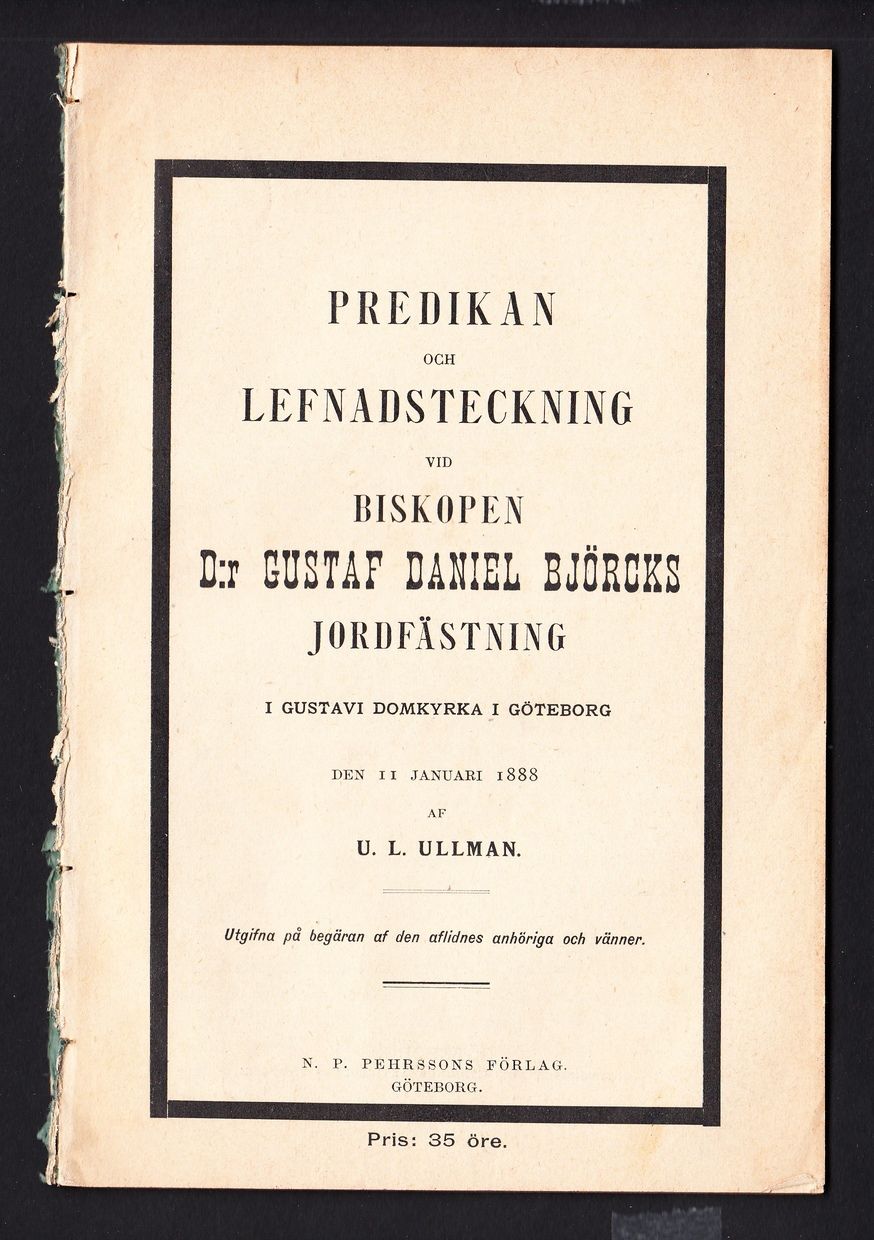 Predikan och lefnadsteckning vid biskopen D:r Gustaf Daniel Björcks jordfästning i Gustavi domkyrka i Göteborg den 11 januari 1888 af U.L. Ullman. Utgifna på begäran af den aflidnes anhöriga och vänner [av] N.P. Pehrssons förlag.