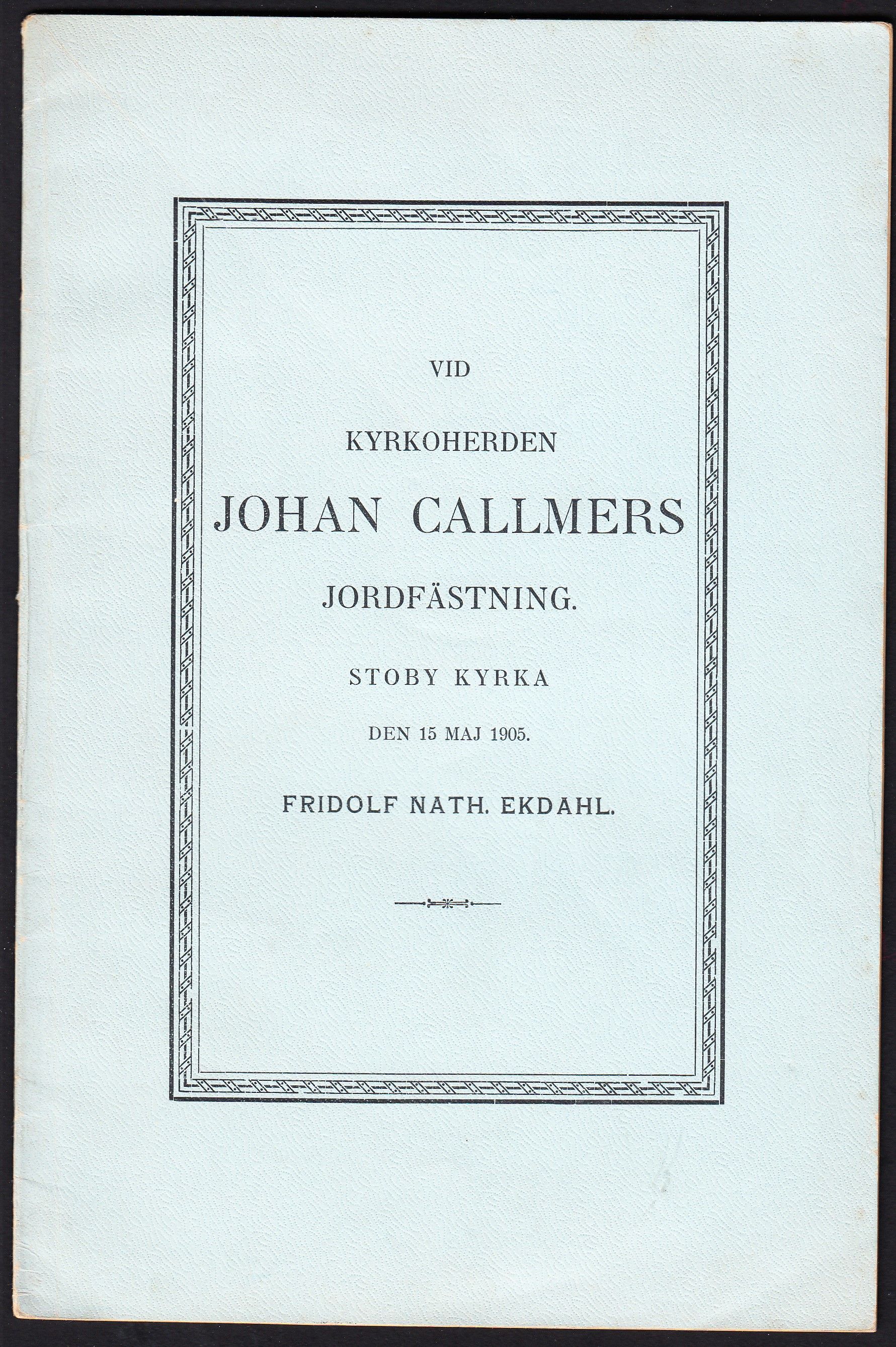 Endast tillgänglig i 1 Libris-bibliotek (KB). Johan Bernhard Laurentius Callmer (1859-1905), kyrkoherde i Stoby, död ogift.