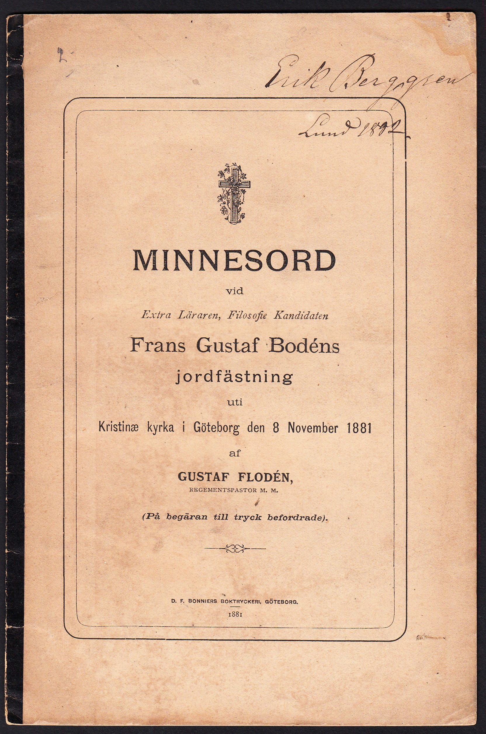 Minnesord vid extra läraren, filosofie kandidaten Frans Gustav Bodéns jordfästning uti Kristinæ kyrka i Göteborg den 8 november 1881 af Gustaf Flodén ... (På begäran till tryck befordrade).