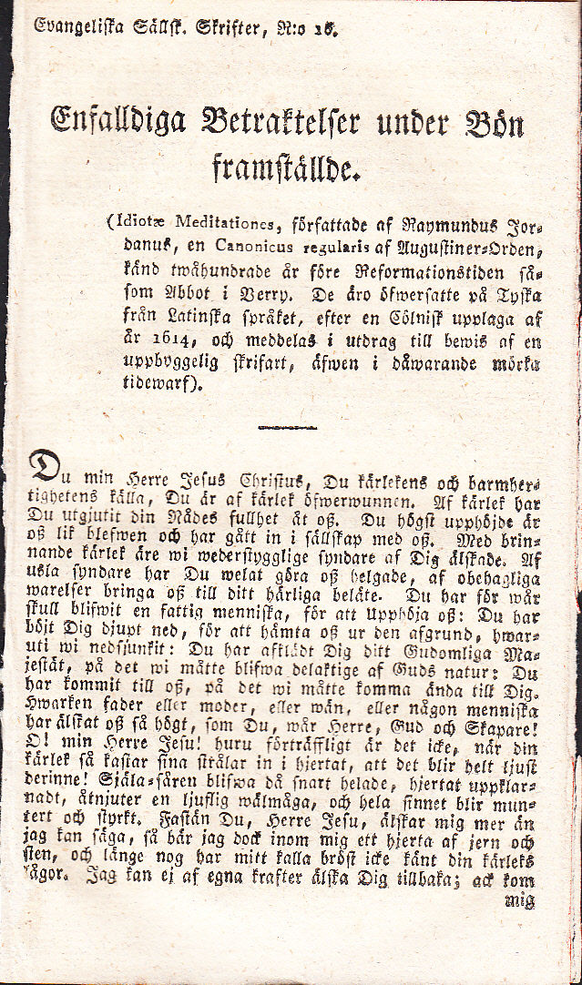 Evangeliska sällskapets skrifter n:o 16. Endast tillgänglig i 1 Libris-bibliotek (KB). Säljes för 3 rst. banco stycket, och kan i parti fås uti bokbindare ålderman Caloanders bod wid röda slussen, 100 för 18 sk. banco. Raymundus Jordanus, mest känd under sin latinska pseudonym Idiota (Idioten), det behöver förstås inte användas som det gör idag, det betyder ursprungligen enkel eller märkliga, och det är troligt att författaren i fråga använde det i denna mening att han var en person utan betydelse. Det är känt att Raymundus var fransman, när denna bok trycktes ska han ha varit abbot i Berry, Frankrike. Hans bok ‘Meditationer’ innehåller sex kapitel: (1) De amore divino; (2) De Virgine Maria; (3) De vera Patientia; (4) De albas conflictu carnis et Animae; (5) De Innocentia perdita; (6) De morte. Evangeliska sällskapet i Stockholm, ett av enskilda personer 1808 stiftat och av k. m:t 1809 stadfäst samfund för spridande av smärre andaktsskrifter till uppbyggelse och näring för det religiösa sinnet. Det erhöll bidrag även från England och Skotland, särdeles av den s. k. ‘Religious Tracts society’ i London. Dess skrifter spreds bland alla samhällsklasser, främst bland de fattigare, plägade utdelas vid husförhör och till nattvardsungdom samt översattes på lappska och finska språken. Sällskapet spridde även bibelupplagor, och då Svenska bibelsällskapet 1815 stiftades, överlämnade Evangeliska sällskapet till detsamma sin egendom.