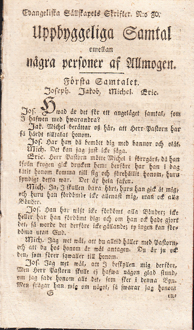 Uppbyggeliga samtal emellan några personer af allmogen [= rubrik].