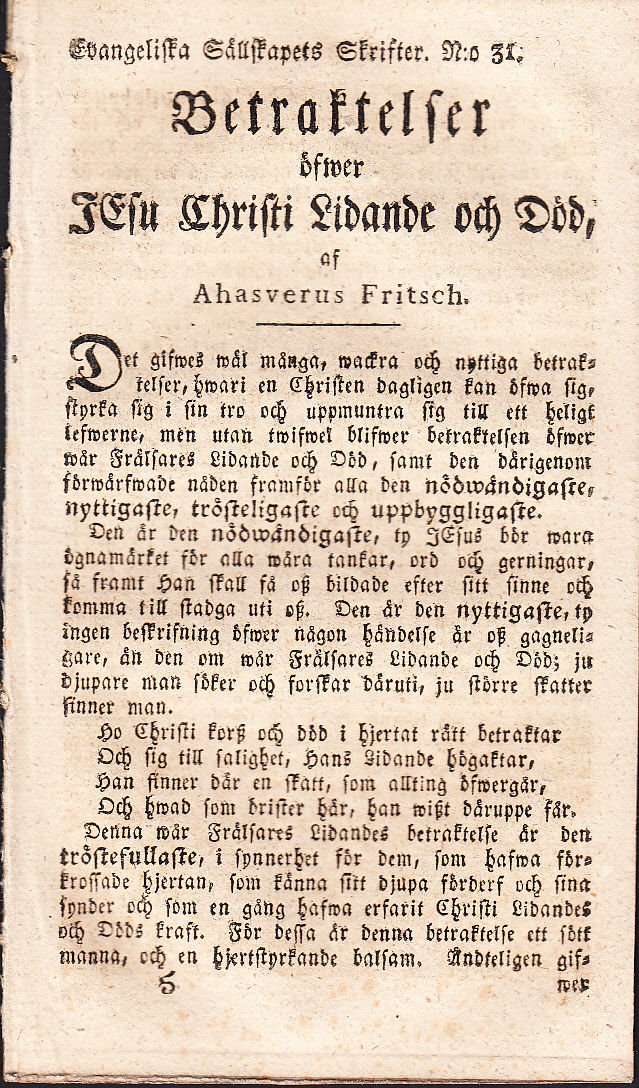 Betraktelser öfwer Jesu Christi lidande och död, af Ahasverus Fritsch [= rubrik].