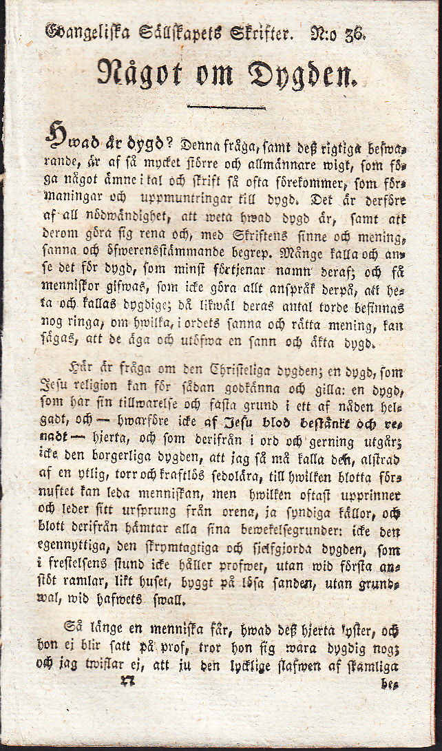 Evangeliska sällskapets skrifter n:o 36. Endast tillgänglig i 1 Libris-bibliotek (KB). Utkom s.å. i en upplaga om endast 12 sid. Säljes för 9 rst. banco stycket, och kan i parti fås i bokbindareålderman Caloanders bod wid strömqwarnen, 100 för 36 sk. banco. Evangeliska sällskapet i Stockholm, ett av enskilda personer 1808 stiftat och av k. m:t 1809 stadfäst samfund för spridande av smärre andaktsskrifter till uppbyggelse och näring för det religiösa sinnet. Det erhöll bidrag även från England och Skotland, särdeles av den s. k. ‘Religious Tracts society’ i London. Dess skrifter spreds bland alla samhällsklasser, främst bland de fattigare, plägade utdelas vid husförhör och till nattvardsungdom samt översattes på lappska och finska språken. Sällskapet spridde även bibelupplagor, och då Svenska bibelsällskapet 1815 stiftades, överlämnade Evangeliska sällskapet till detsamma sin egendom.