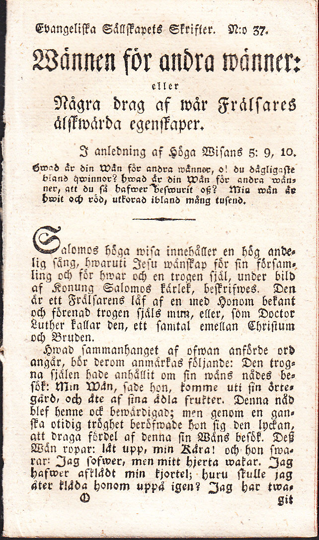 Evangeliska sällskapets skrifter n:o 37. Endast tillgänglig i 2 Libris-bibliotek (KB, Linköping SB). Säljes för 1 sk. banco stycket, och kan i parti fås i bokbindare-åldermannen Caloanders bod wid strömqwarnen, 100 för 1 r:dr banco. Evangeliska sällskapet i Stockholm, ett av enskilda personer 1808 stiftat och av k. m:t 1809 stadfäst samfund för spridande av smärre andaktsskrifter till uppbyggelse och näring för det religiösa sinnet. Det erhöll bidrag även från England och Skotland, särdeles av den s. k. ‘Religious Tracts society’ i London. Dess skrifter spreds bland alla samhällsklasser, främst bland de fattigare, plägade utdelas vid husförhör och till nattvardsungdom samt översattes på lappska och finska språken. Sällskapet spridde även bibelupplagor, och då Svenska bibelsällskapet 1815 stiftades, överlämnade Evangeliska sällskapet till detsamma sin egendom.