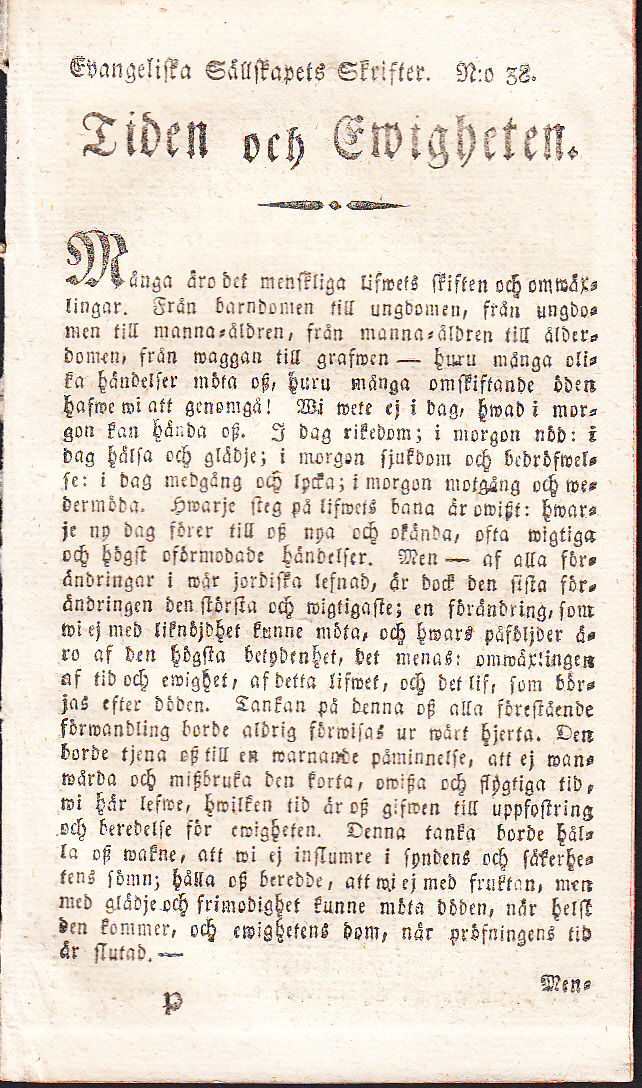 Evangeliska sällskapets skrifter n:o 38. Endast tillgänglig i 1 Libris-bibliotek (KB). Säljes för 1 sk. banco stycket, och kan i parti fås i bokbindare-åldermannen Caloanders bod wid strömqwarnen, 100 för 1 r:d banco. Evangeliska sällskapet i Stockholm, ett av enskilda personer 1808 stiftat och av k. m:t 1809 stadfäst samfund för spridande av smärre andaktsskrifter till uppbyggelse och näring för det religiösa sinnet. Det erhöll bidrag även från England och Skotland, särdeles av den s. k. ‘Religious Tracts society’ i London. Dess skrifter spreds bland alla samhällsklasser, främst bland de fattigare, plägade utdelas vid husförhör och till nattvardsungdom samt översattes på lappska och finska språken. Sällskapet spridde även bibelupplagor, och då Svenska bibelsällskapet 1815 stiftades, överlämnade Evangeliska sällskapet till detsamma sin egendom.